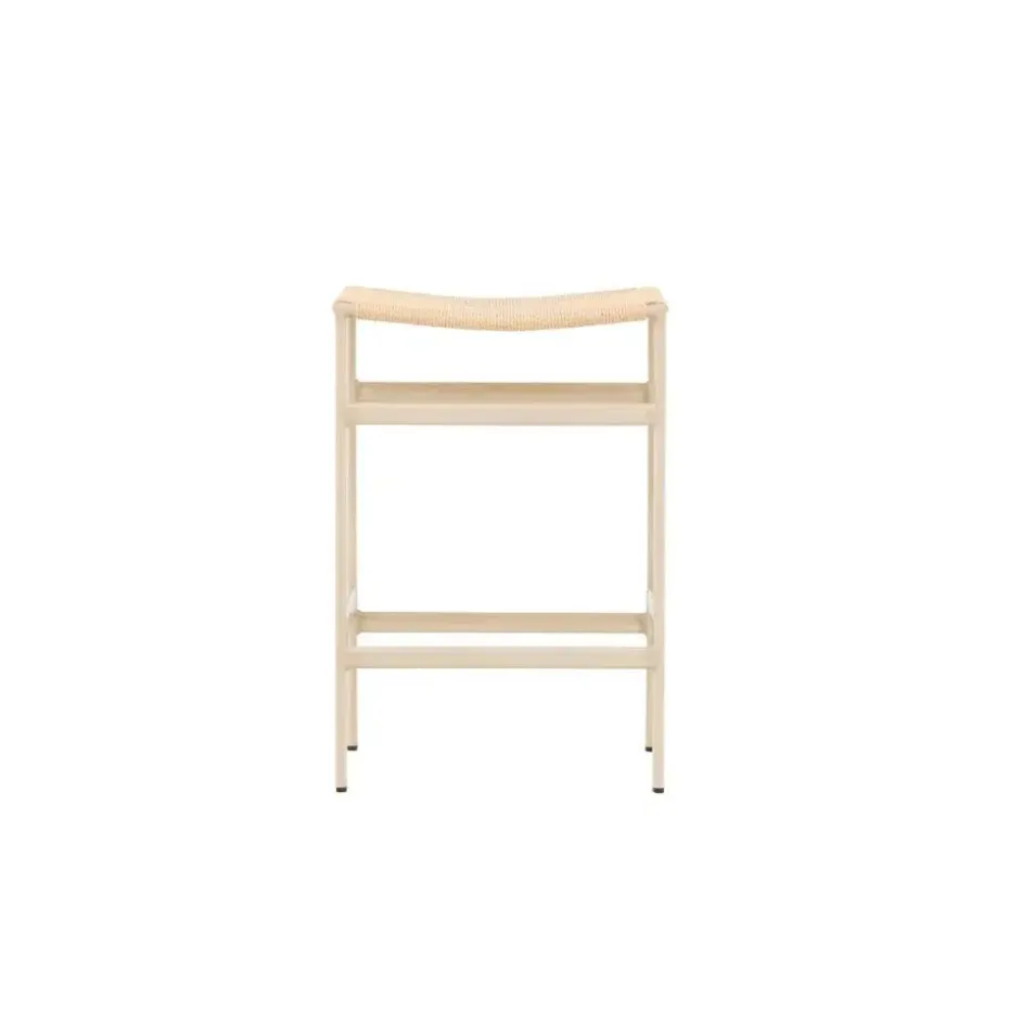 De poten van de kruk zijn witgewassen, wat ze een zachte en subtiele afwerking geeft die de natuurlijk gekleurde touwzitting complimenteert. Deze combinatie van kleuren en materialen creëert een harmonieuze en uitnodigende uitstraling die perfect past in moderne, lichte omgevingen.