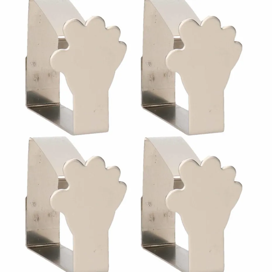 Set van 4 zilverkleurige tafelkleedklemmen in handjesvorm – ca. 5 x 4 cm*Deze set bevat vier decoratieve tafelkleedklemmen in de vorm van zilverkleurige handjes. Ze zijn gemaakt van metaal en ideaal om tafelkleden of tafelzeilen stevig aan de tafel vast te zetten, zodat ze niet kunnen wegwaaien. Met een formaat van ongeveer 5 x 4 cm per klem combineren ze functionaliteit met een speels design. Perfect voor gebruik binnen en buiten, vooral voor tuintafelkleden.