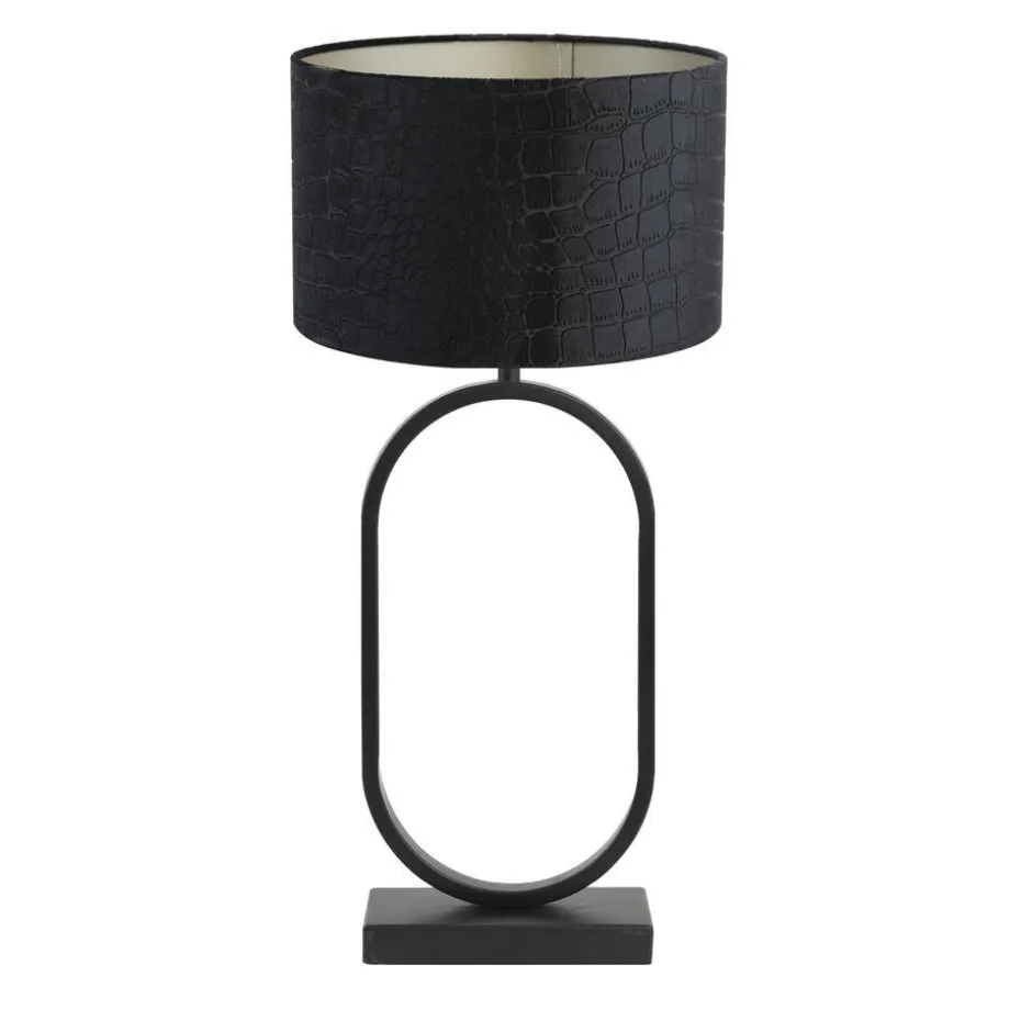 Op zoek naar de perfecte tafellamp inclusief lampenkap? De Jamiri is een moderne zwarte lampvoet van metaal en wordt geleverd inclusief cilinder lampenkap Praya. Dit is een zwarte lampenkap met krokodillenprint, gemaakt van een luxe glanzende velvet stof. De mat zwarte lampvoet past in ieder interieur en is daarom een gegarandeerd tijdloze tafellamp in de woonkamer of als nachtlampje in de slaapkamer. Doordat de voet inclusief kap wordt geleverd, hoef jij je geen zorgen te maken of de verhoudingen wel kloppen. De kap past perfect op de ovale lampvoet. De totale afmeting van de tafellamp is 30x30x67 cm.