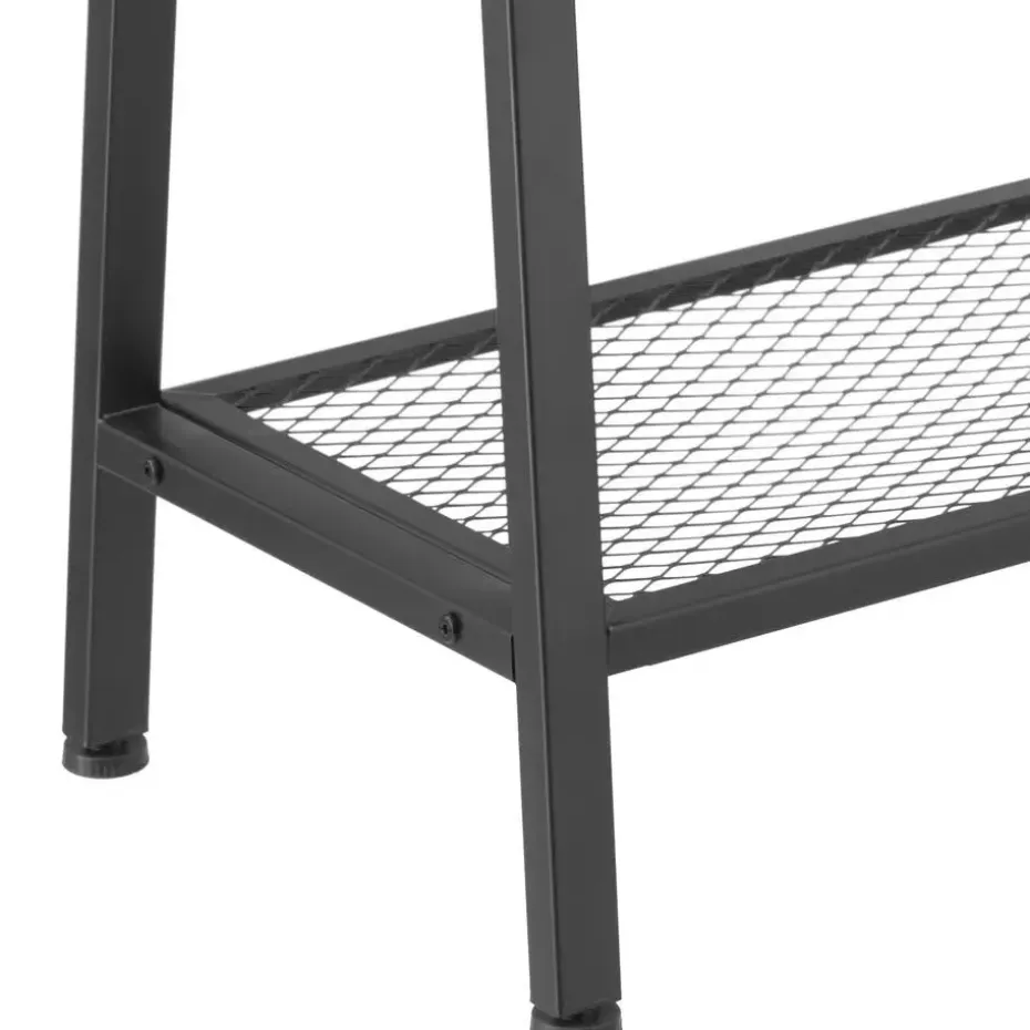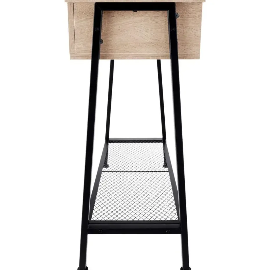Met de minimalistische consoletafel Tralee vind het industriële charme intrede in je inrichting. Naast de hoekige vormgeving heeft de tafel typische contrasten die ontstaan door de combinatie van hard, koel staal en uitnodigend, warm hout. De rustieke roosterplank in het onderste gedeelte versterkt de ruwe fabriekslook en geeft de onderhoudsvriendelijke constructie naast de grote opbergruimte en het brede opbergvak veel stevigheid. Een aantrekkelijk detail zijn de trapeziumvormige poten die samen met de in hoogte verstelbare pootjes van vloervriendelijke kunststof voor een hoge stabiliteit zorgen. Let op: Montage vereist