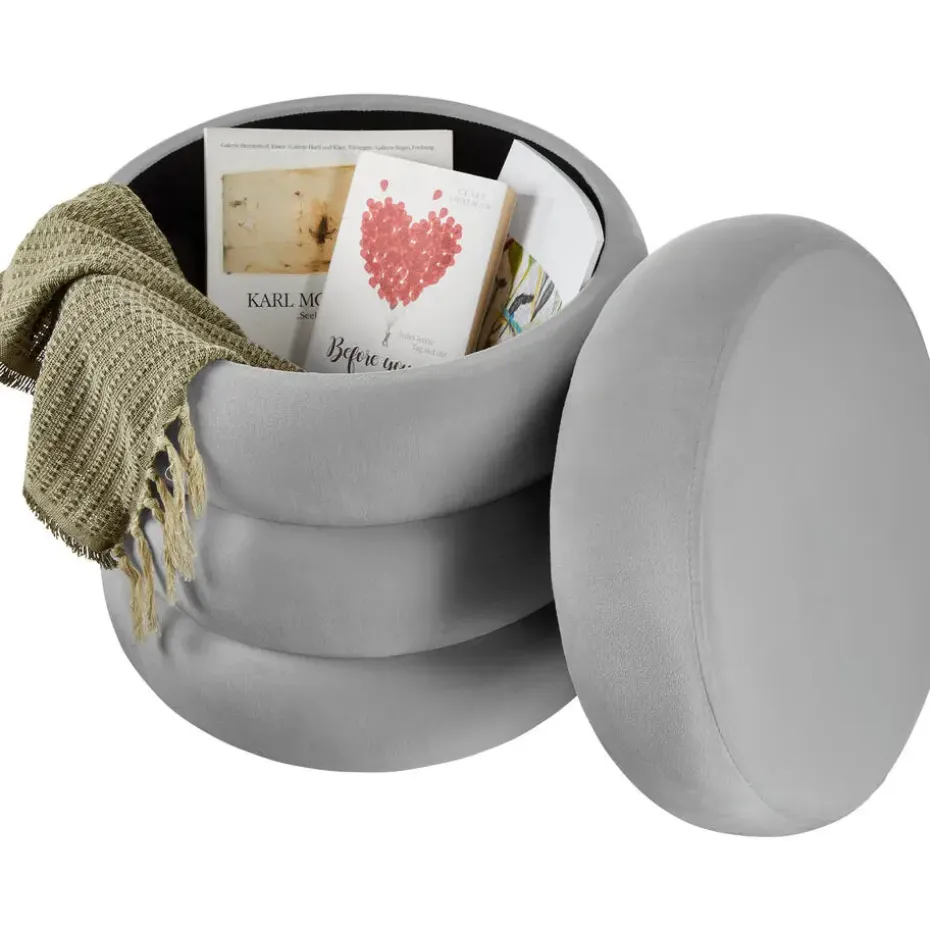 De hocker Altu van tectake combineert op vakkundige wijze modern design met hoge functionaliteit. Met zijn ronde vorm en elegante fluwelen bekleding past hij naadloos in elke ruimte en biedt dankzij het afneembare deksel royale opbergruimte voor dekens,kussens of andere alledaagse voorwerpen.