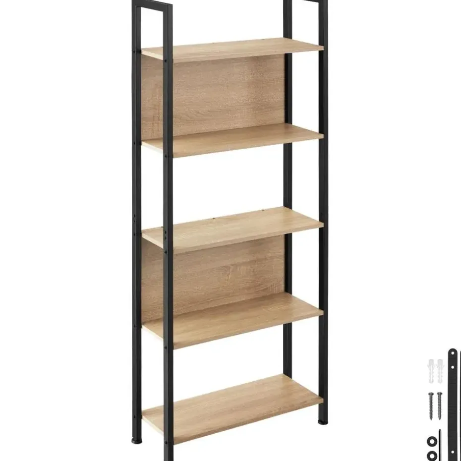 Met het functionele wandrek Westport van tectake voeg je een chique presentatieruimte toe aan je interieur. De karakteristieke uitstraling van de onderhoudsvriendelijke constructie is door de minimalistische vormgeving met industriële uitstraling een opvallende symbiose van hout en staal. De vijf niveaus zijn stevig verbonden met het gepoedercoate frame, waardoor de totale constructie een hoge draagkracht heeft. Vier in hoogte verstelbare kunststof poten en een betrouwbare kantelbeveiliging zorgen ervoor dat alle favoriete items op dit modieuze meubel altijd in evenwicht blijven. Let op: Montage vereist