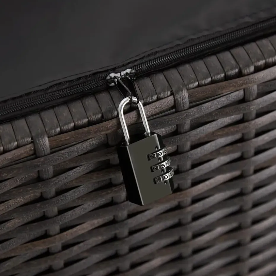 Met zijn grote opbergruimte is de praktische opbergbox Kiruna een ideale aanvulling op elke buitenruimte. Onder de verstevigde hoes bevindt zich een afsluitbare binnenzak die stof, vuil en vocht buiten houdt en extra kan worden beveiligd met het meegeleverde cijferslot. Dankzij de twee handgrepen en de twee zwenkwielen is de compacte constructie met het stevige stalen frame gemakkelijk te verplaatsen. Deze stijlvolle en veelzijdige wicker opbergbox kan eenvoudig in elke tuinomgeving worden geïntegreerd. Let op: Montage vereist
