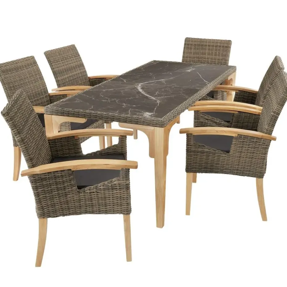Haal een zomerse sfeer in je tuin met de charmante wicker set bestaande uit de grote tafel Foggia en zes stoelen Rosarno. Zachte zitkussens en comfortabele armleuningen en rugleuningen kenmerken de even comfortabele als stabiele zit. Een bijzondere blikvanger is de royale opbergruimte van twee veerkrachtige marmerlook platen. De hoogwaardige materiaal mix van de zevendelige set scoort niet alleen door zijn aantrekkelijke uiterlijk, maar ook door zijn ongevoeligheid voor weersinvloeden van buitenaf – het zomerseizoen is verleidelijk, geniet ervan met volle teugen met dit chique ensemble. Let op: Montage vereist