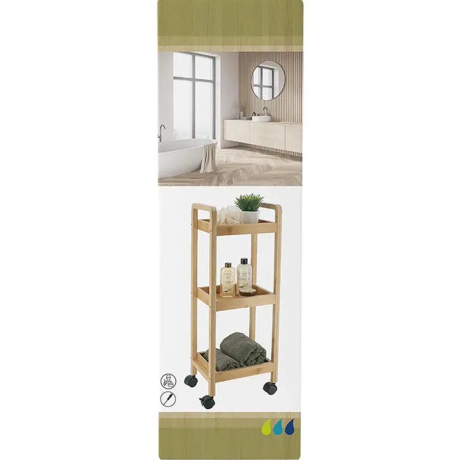 Deze 3-laagse keukentrolley/badkamer trolley is een praktische en stijlvolle oplossing voor extra opbergruimte in de keuken of de badkamer. De trolley is vervaardigd uit hoogwaardig bamboe hout en is voorzien van vier soepel rollende wieltjes, waardoor je hem gemakkelijk kunt verplaatsen. Met zijn compacte afmetingen past hij perfect in kleinere keukens, badkamers, of andere ruimtes waar je flexibele opbergruimte nodig hebt. Met deze keukentrolley op wieltjes creeer je extra opbergruimte waar je maar wilt, en de 3-laagse indeling maakt hem veelzijdig en ideaal voor dagelijks gebruik in elke ruimte van het huis! Afmeting trolley: ca. 46 x 14 x 48 cm. Materiaal: kunststof. Merk: Tendance.