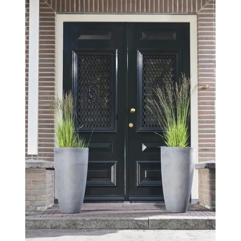 Hoge bloempot/plantenpot of vaas van gerecycled kunststof en steenpoeder in de kleur donkergrijs met diameter 29 cm en hoogte 50 cm. Potten/vazen voor kamerplanten, buitenplanten, bloemen of kunstplanten. Deze bleoemenvaas/pot voor binnen en buiten heeft een stijlvolle uitstraling in elk interieur. Een unieke duurzame mix van materialen dat nu geen afval is, maar een prachtige duurzame bloempot. Een sterke, mooie pot die vriendelijk is voor het milieu en de portemonnee. De pot/vaas heeft gaatjes in de onderkant dus een opvangschaal is voor binnen gebruik vereist. Zoeknaam serie voor de schaal is Nova concrete donkergrijs. Deze serie potten hebben een eigen drainagesysteem onderin de pot.