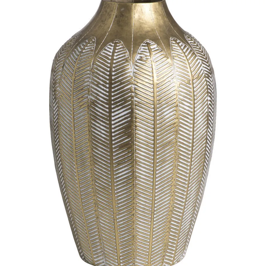Vaas Flora is een goudkleurige metalen eyecatcher met een verfijnde afwerking die meteen de aandacht trekt. Rondom de vaas zijn verticale ovale vormen aangebracht, elk voorzien van een patroon dat doet denken aan een bladnerf. Deze structuur geeft het oppervlak een natuurlijke en elegante uitstraling, terwijl het reliëf zorgt voor een subtiele diepte en een mooie reflectie van het licht. Met een formaat van 46,5×28,5 cm is de vaas groot genoeg om op zichzelf te staan, maar ook uitstekend geschikt voor decoratieve takken of droogbloemen. Het stevige metaal maakt de vaas solide en vormvast, waardoor je er lang plezier van hebt. Door de combinatie van het goudkleurige oppervlak en het organische patroon voeg je in één keer warmte en klasse toe aan je interieur. Als je op zoek bent naar een robuuste, stijlvolle vaas met een natuurlijke structuur en luxe uitstraling, dan is metalen vaas Flora in goudkleur een goede keuze.