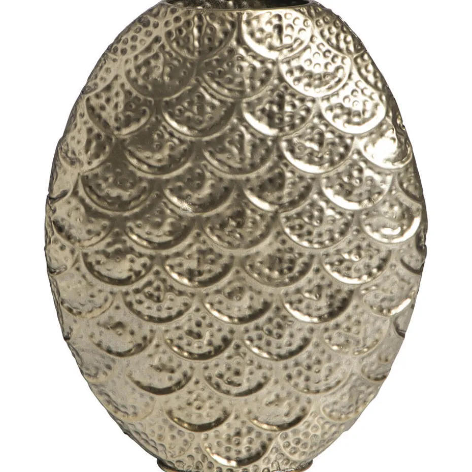 Vaas Florence is een goudkleurige metalen decoratie met een opvallend geschubd reliëf dat direct in het oog springt. Het patroon over het gehele oppervlak doet denken aan fijne schubben, wat zorgt voor een levendige textuur en een speels spel van licht en schaduw. Door de combinatie van het smalle silhouet en de afgeronde vormen straalt de vaas elegantie uit, terwijl het reliëf zorgt voor karakter en diepte. Met afmetingen van 35×27,5×9 cm past deze vaas perfect op een smalle plank, vensterbank of dressoir. Het stevige metaal zorgt voor stabiliteit en een solide uitstraling, waardoor de vaas een blijvende toevoeging is aan je interieur. Dankzij het slanke ontwerp is hij goed te combineren met andere woonaccessoires, maar ook sterk genoeg om solo te schitteren. Als je op zoek bent naar een stijlvolle, compacte vaas met karakter en een luxe afwerking, dan is metalen vaas Florence in goudkleur een goede keuze.