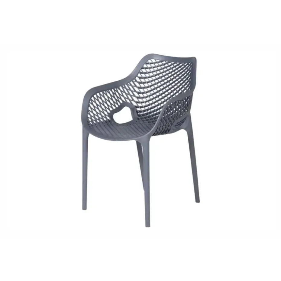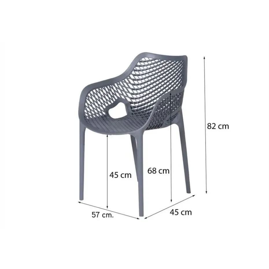De Madino Air stapelbare stoel grijs is gemaakt van 100% polypropyleen een zeer hoogwaardige kunststof. Dit materiaal is kleurvast, krasbestendig, 100% UV-bestendig en eenvoudig schoon te houden. De Madino Air stapelbare stoel grijs heeft een comfortabel zitgedeelte met een webstructuur. U kunt de stoel schoon maken met een lauwwarm sopje. Gebruik hierbij altijd een spons of zachte doek. De Madino Airheeft een zithoogte van 45 cm. en een armleuninghoogte van 68 cm.