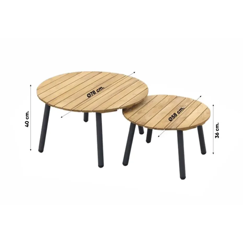 De Mindo loungetafels zijn een combinatie van een teakhouten tafelblad en aluminium onderstel. De ronde tafelbladen bestaan uit smalle latjes die zorgen voor een karakteristieke en warme uitstraling. Het aluminium onderstel vraagt nauwelijks onderhoud en is ideaal voor buitengebruik. De tafels hebben een diameter van Ø80 cm en Ø60 cm. Het teakhout hoeft niet per se behandeld te worden, maar wie de kleur en kwaliteit extra wil beschermen, kan kiezen voor eenteak shielddat het hout waterafstotend maakt. Laat je het hout onbehandeld, dan zal het op natuurlijke wijze vergrijzen. Wil je liever de originele tint behouden? Dan is eenteak protector de beste keuze.