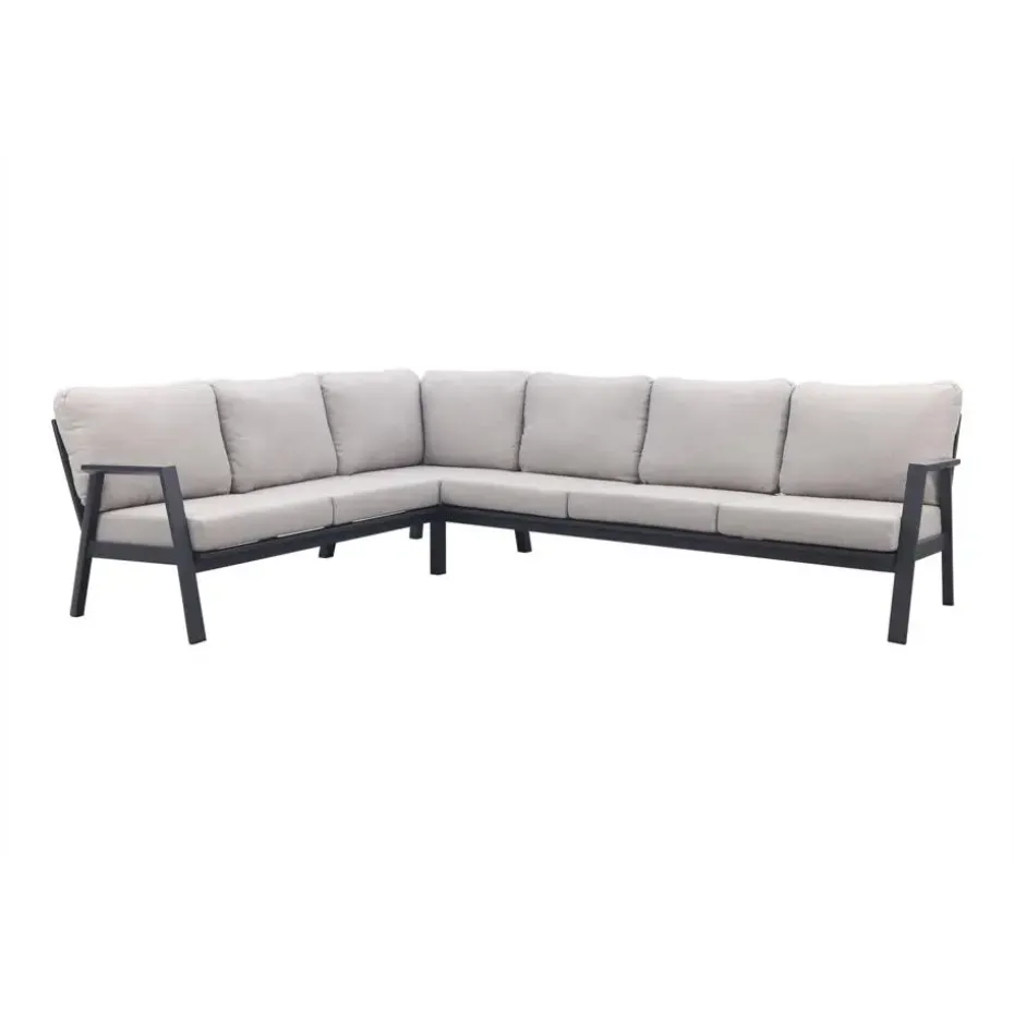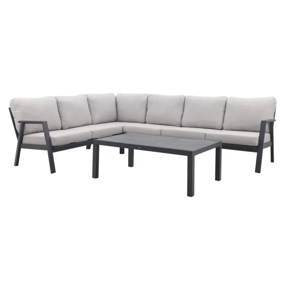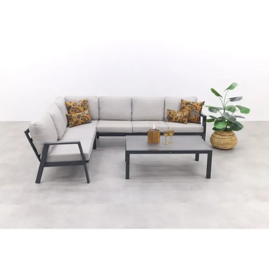 De Viento hoekbank in Royal Grey is perfect voor een gezellige zithoek buiten. De bank biedt plek aan 5 tot 6 personen en heeft een stevig aluminium frame met een kras- en stootvaste coating in antracietkleur. De zachte kussens zorgen voor veel comfort en hebben afritsbare hoezen die je makkelijk kunt wassen. Zo blijft de bank er altijd netjes uitzien. Met zijn moderne uitstraling en onderhoudsvriendelijke materialen is deze hoekbank ideaal voor ontspannen momenten in je tuin of op je terras!
