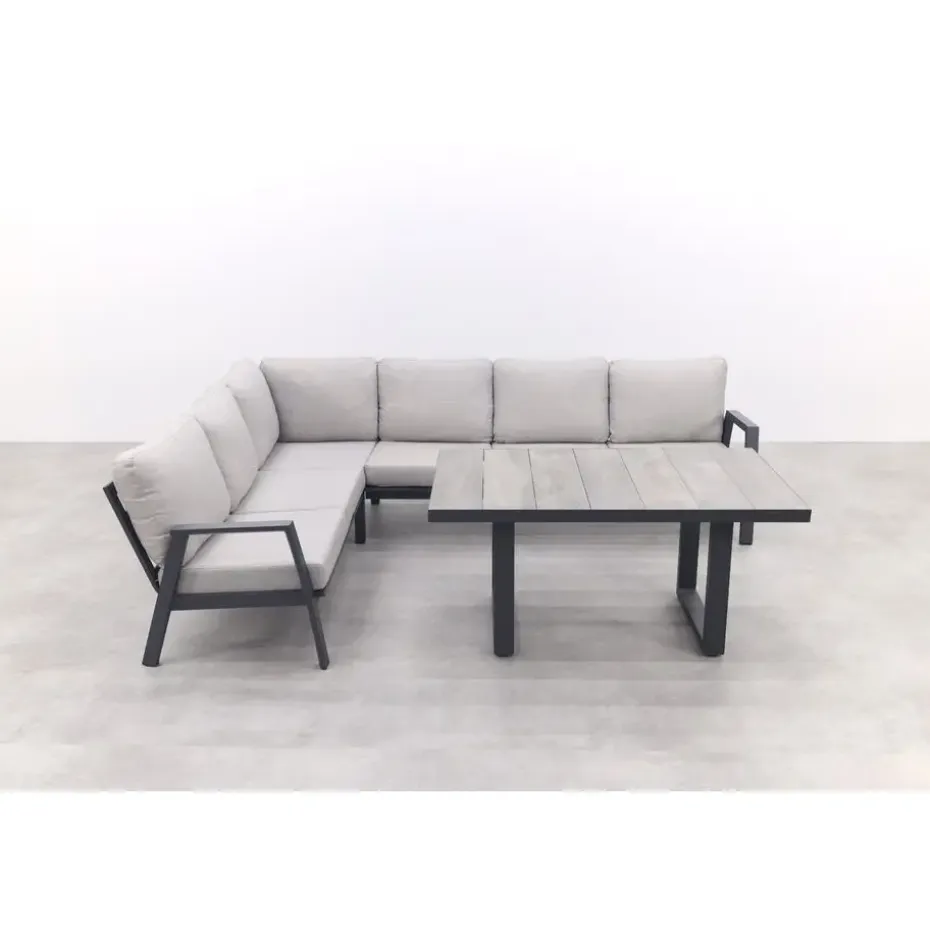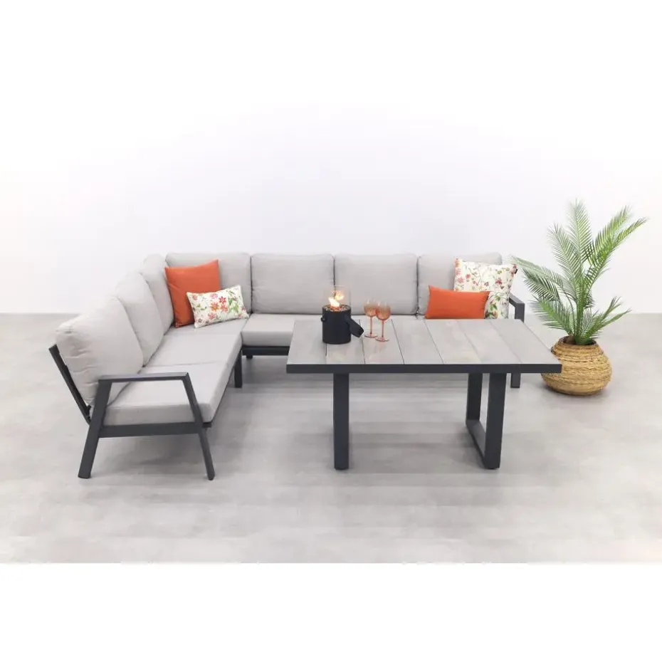 De Viento hoekbank en Darwin loungetafel vormen samen een fijne en praktische loungeset voor je tuin of terras. De ruime hoekbank biedt plek aan 5 tot 6 personen, perfect om samen te genieten van een drankje of te relaxen in de zon. Dankzij de hogere Darwin loungetafel is deze set ook ideaal voor lounge dining – ontspannen eten en drinken op een comfortabele hoogte. Het krasvaste keramieken blad en stevige aluminium frame maken de tafel makkelijk in onderhoud en voegen een moderne, stoere uitstraling toe aan je buitenruimte.