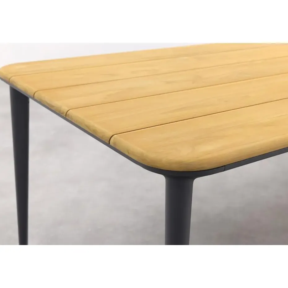 De Alaska tuintafel is een schitterende combinatie van een teakhouten tafelblad en een aluminium frame. Het warme, bruine tafelblad creëert een gezellige sfeer. Teakhout is natuurlijk materiaal dat na verloop van tijd natuurlijk kan gaan vergrijzen. Deze karakteristieke eigenschap past bij de charme van de tafel. De bruine kleur kun je eenvoudig terug krijgen door het juiste onderhoud. Het tafelblad ligt op een aluminium frame met taps toelopende poten. Aluminium heeft als voordelen dat het licht van gewicht is, onderhoudsvriendelijk en heel erg stevig.