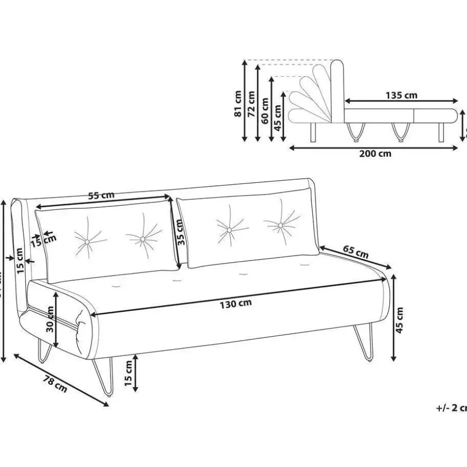 Belangrijkste eigenschappen: Zeer gemakkelijk te veranderen in een bed, Rugleuning in 5 posities verstelbaar, Retro Stijl, Elegant accentstuk, Versiert met knoopdetails
