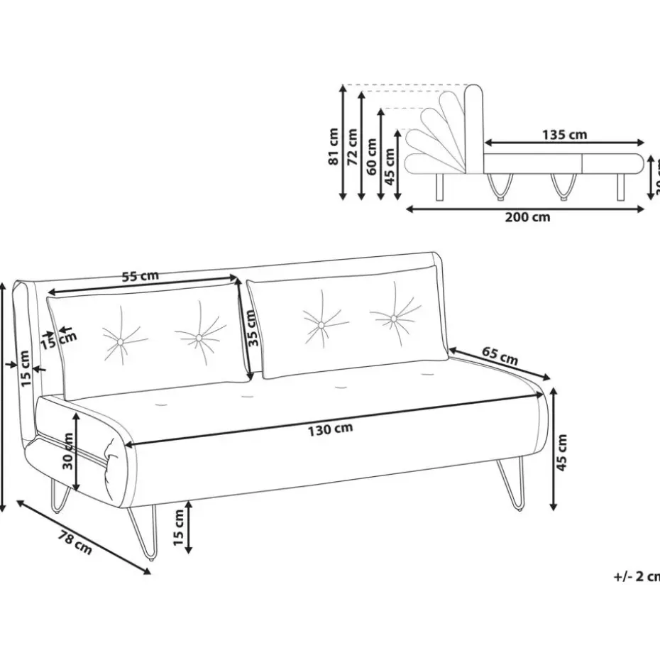 Belangrijkste eigenschappen: Zeer gemakkelijk te veranderen in een bed, Rugleuning in 5 posities verstelbaar, Retro Stijl, Elegant accentstuk, Versiert met knoopdetails