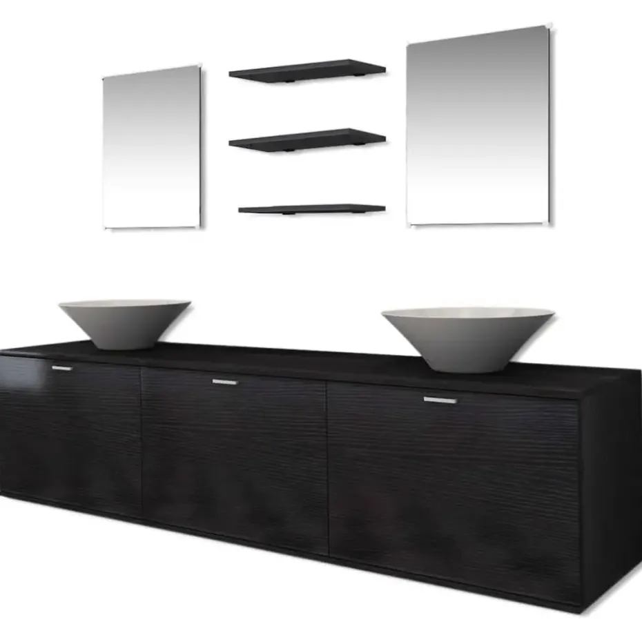 Deze complete set, bestaande uit 1 muurgehangen badkamerkastje, 2 spiegels, 3 planken, 2 wasbakken en 2 kranen, zal een fantastische toevoeging voor uw badkamer zijn, en optimaliseert de ruimte zonder op stijl in te leveren.