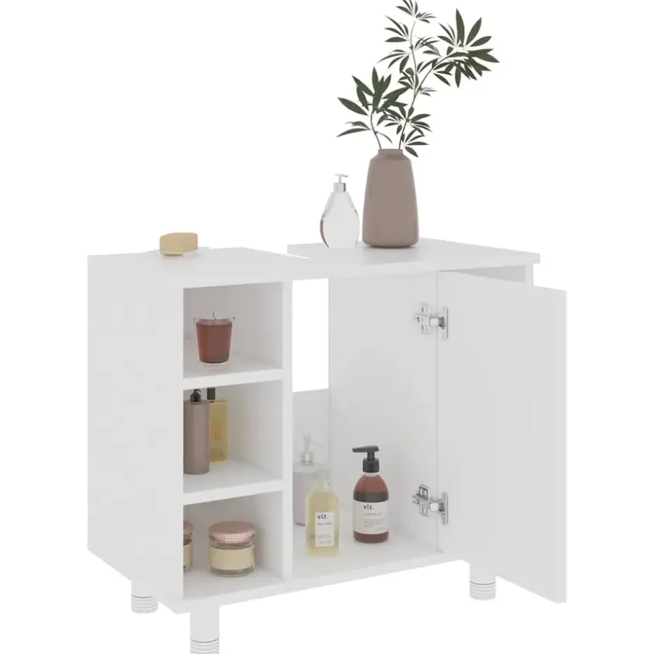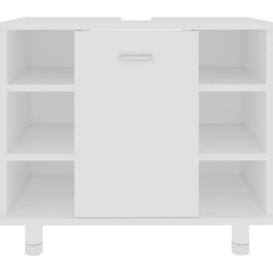 Deze chique kast is gemaakt van bewerkt hout, waardoor hij stevig en stabiel is. De opbergkast heeft 7 vakken en 1 deur, waardoor je verschillende opbergopties en extra ruimte hebt om spullen in je badkamer op te bergen. De deur heeft een handgreep voor gemakkelijk openen en sluiten. De kast is eenvoudig schoon te maken met een vochtige doek.