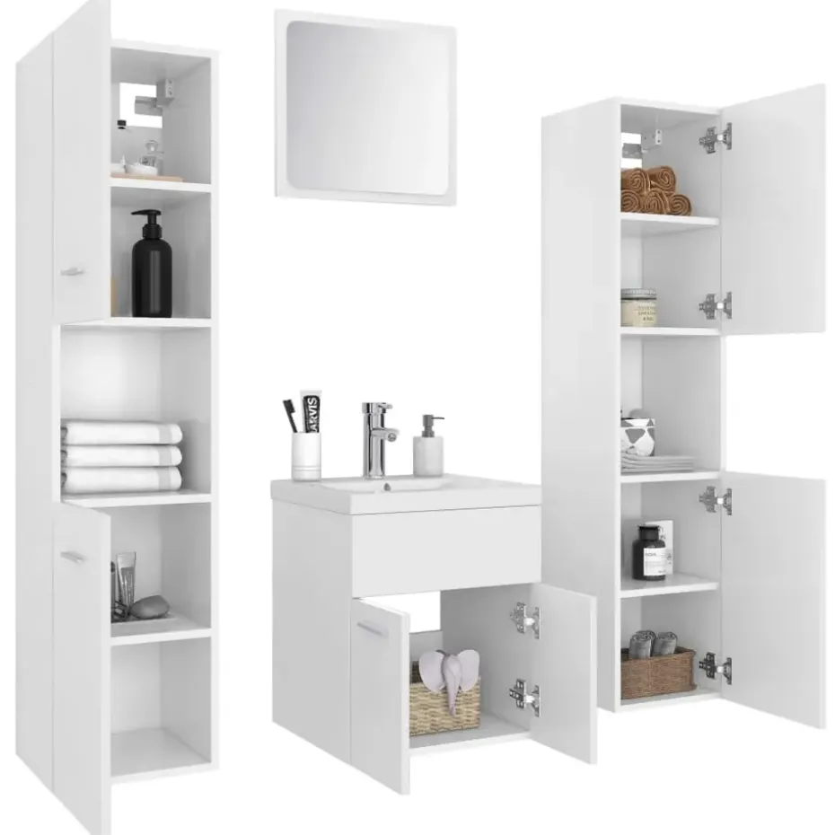 De meubelset bestaat uit een wastafelkast met een wasbak, 2 hoge kasten en een spiegel. De chique wastafelkast heeft 1 vak en past perfect onder je wastafel, waardoor hij heel handig is. De wastafel is gemaakt van keramiek en dient niet alleen als product voor dagelijks gebruik, maar ook als versiering in je leefruimte. Dankzij zijn trendy en eigentijdse ontwerp past deze wastafel beslist in elk interieur. De overloop zorgt ervoor dat de bak nooit kan overlopen. Elke hoge kast heeft in totaal 5 vakken en 2 deuren, waardoor er voldoende ruimte is om spullen in je badkamer op te bergen. De spiegel geeft je interieur een prachtige uitstraling. Deze badkamerset is gemakkelijk schoon te maken met een vochtige doek.