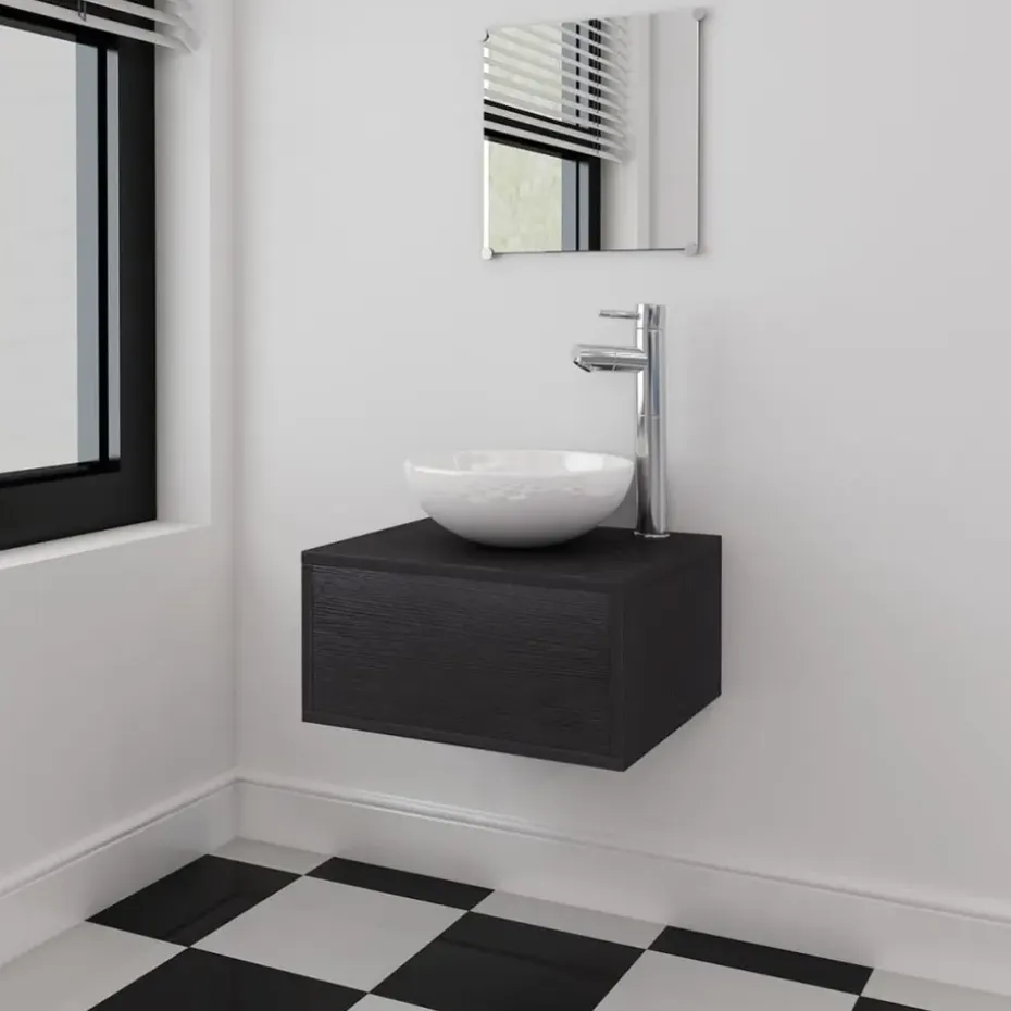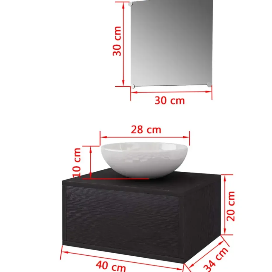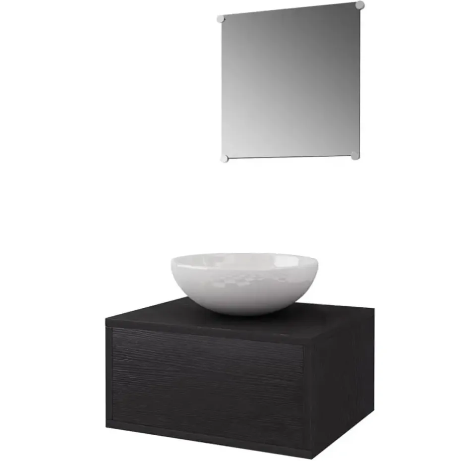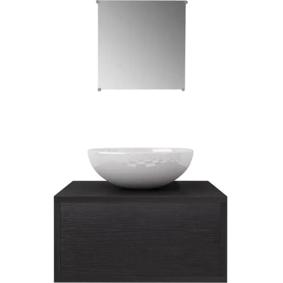 Deze badkamermeubelset wordt geleverd met een spiegel en kastje met wasbak. Het compacte formaat en minimalistische ontwerp maken het een ideale toevoeging aan iedere moderne badkamer. Gemaakt van kwalitatief hoogwaardige spaanplaat, is dit badkamermeubel zeer stevig en duurzaam.