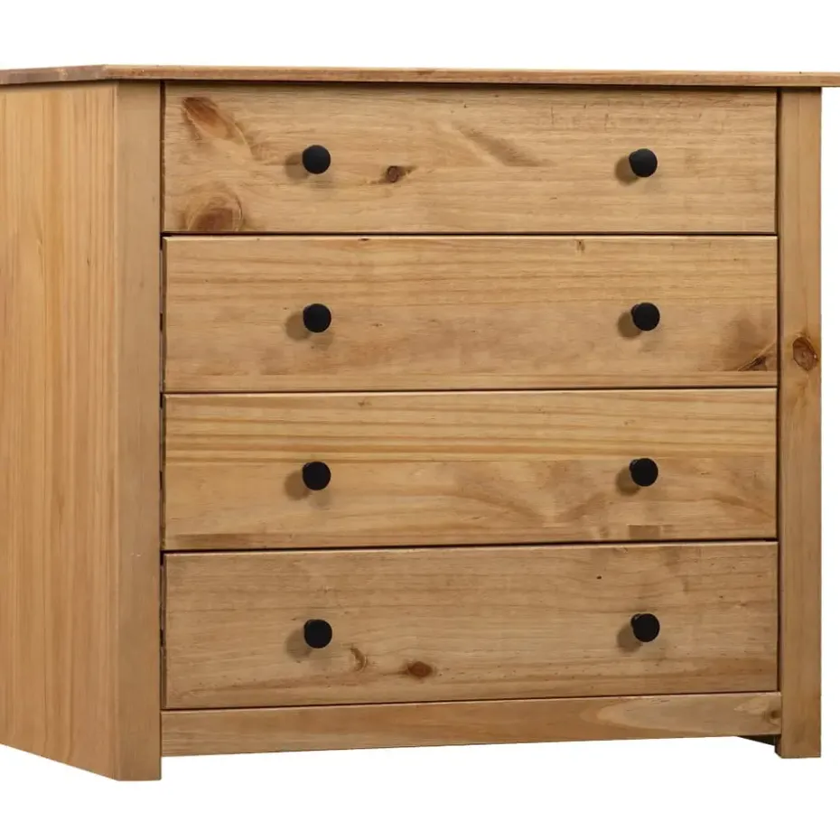 Deze Panama ladekast is gemaakt van massief grenenhout en is zeer duurzaam en stevig. Het dressoir biedt veel opbergruimte dankzij de 4 lades. Het stevige blad is ideaal voor het weergeven van decoratieve objecten, fotolijsten en potplanten. Hij is gemakkelijk schoon te maken met een droge doek. De kast is eenvoudig te monteren.