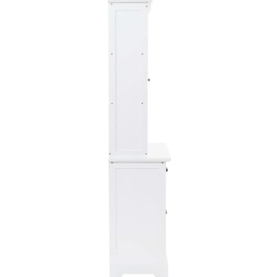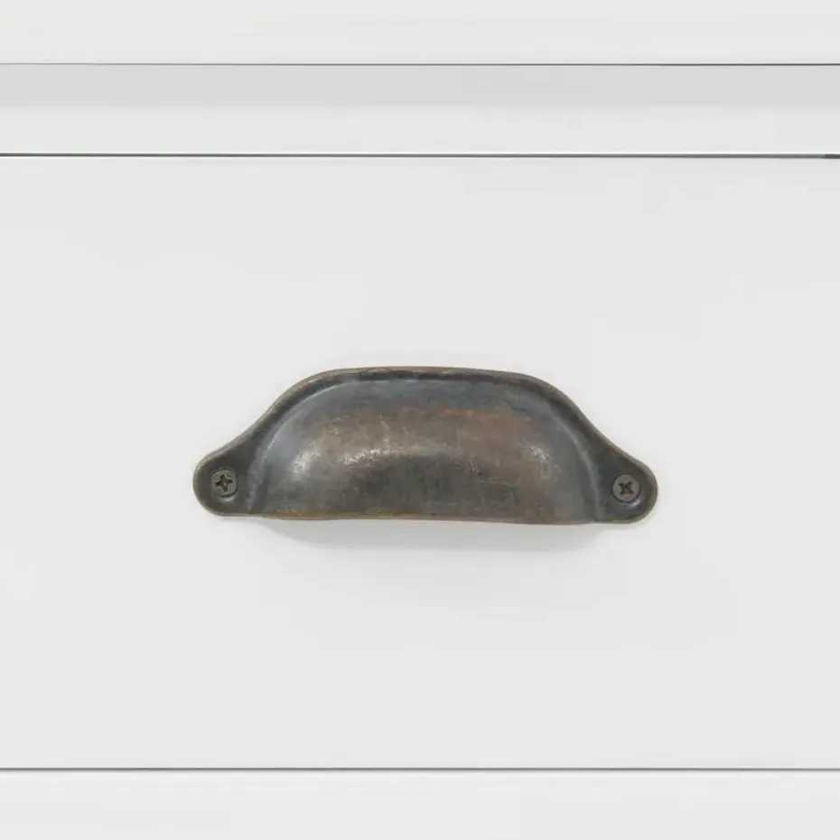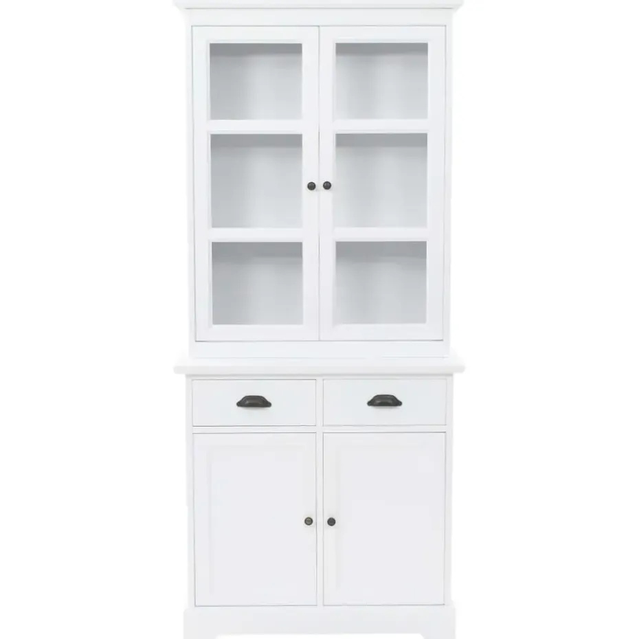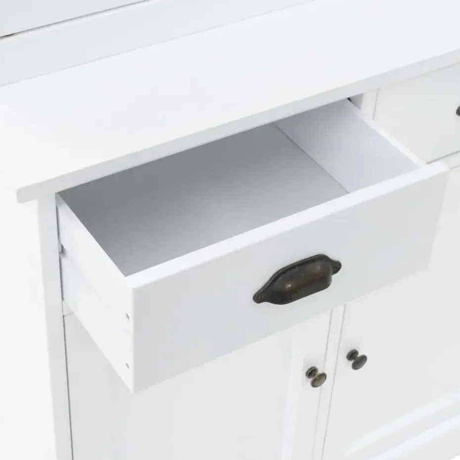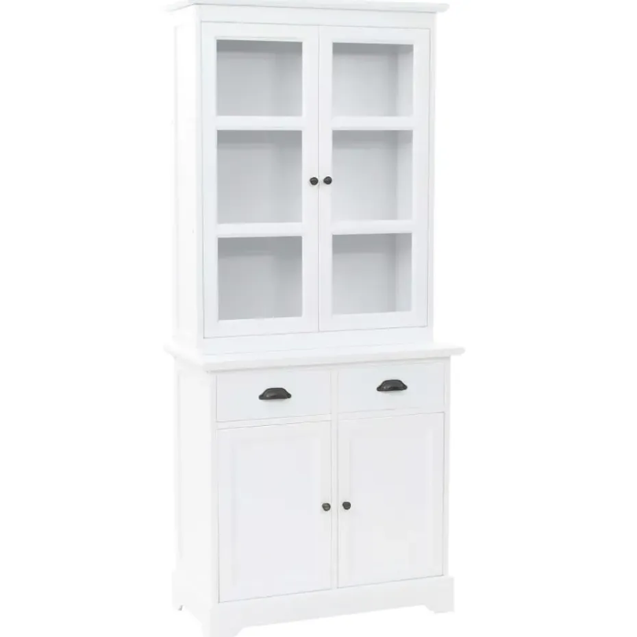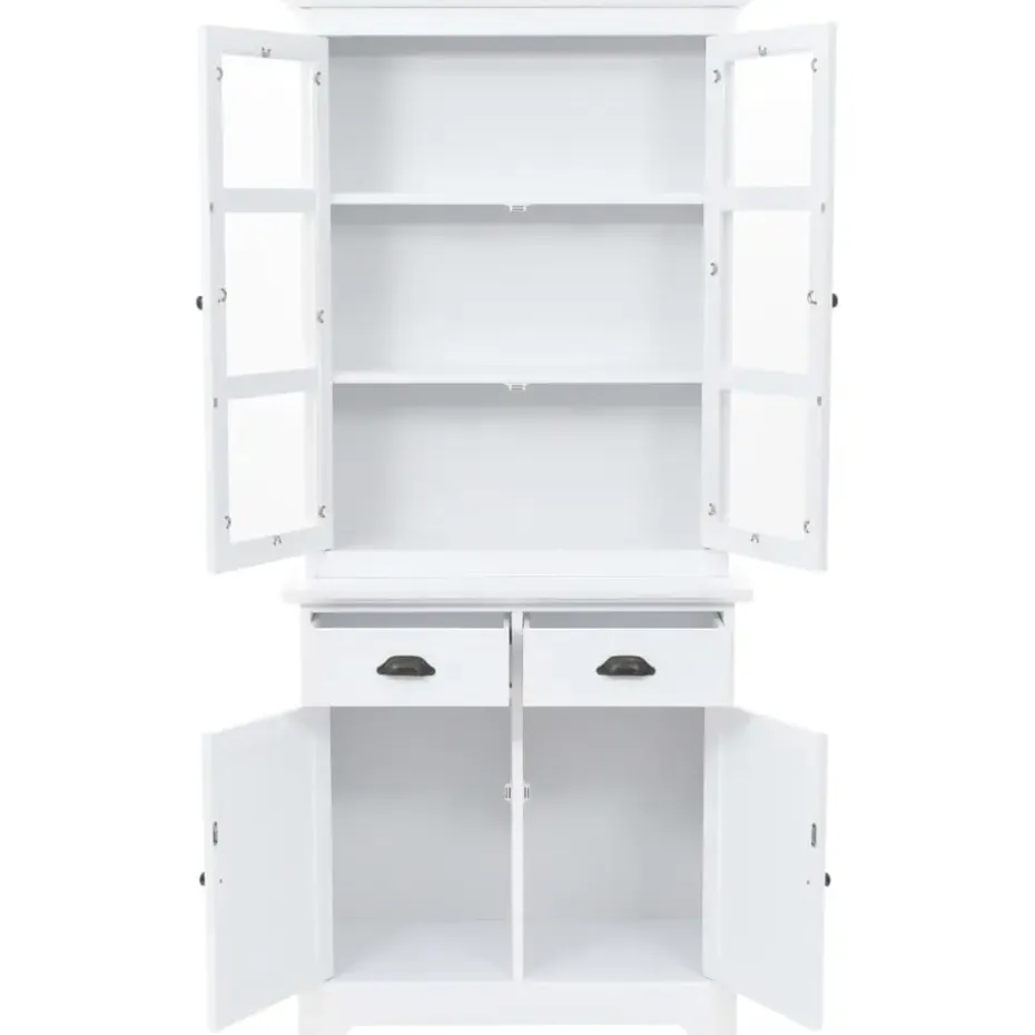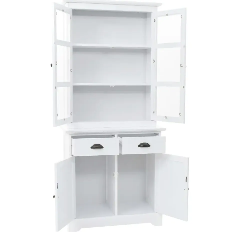 De servieskast is gemaakt van MDF en versierd met metalen handvatten op de deuren en lades. De bovenste 3 opslagruimtes zijn ideaal voor het weergeven van glaswerk en serviezen, maar kan ook worden gebruikt voor het ordenen van een groot aantal boeken, tijdschriften, cd’s, documenten, enz. Met de kunststof deuren kan je de geplaatste spullen mooi weergeven en het stof buiten houden. De 2 lades en 2 kasten hieronder bieden voldoende ruimte voor je persoonlijke bezittingen.