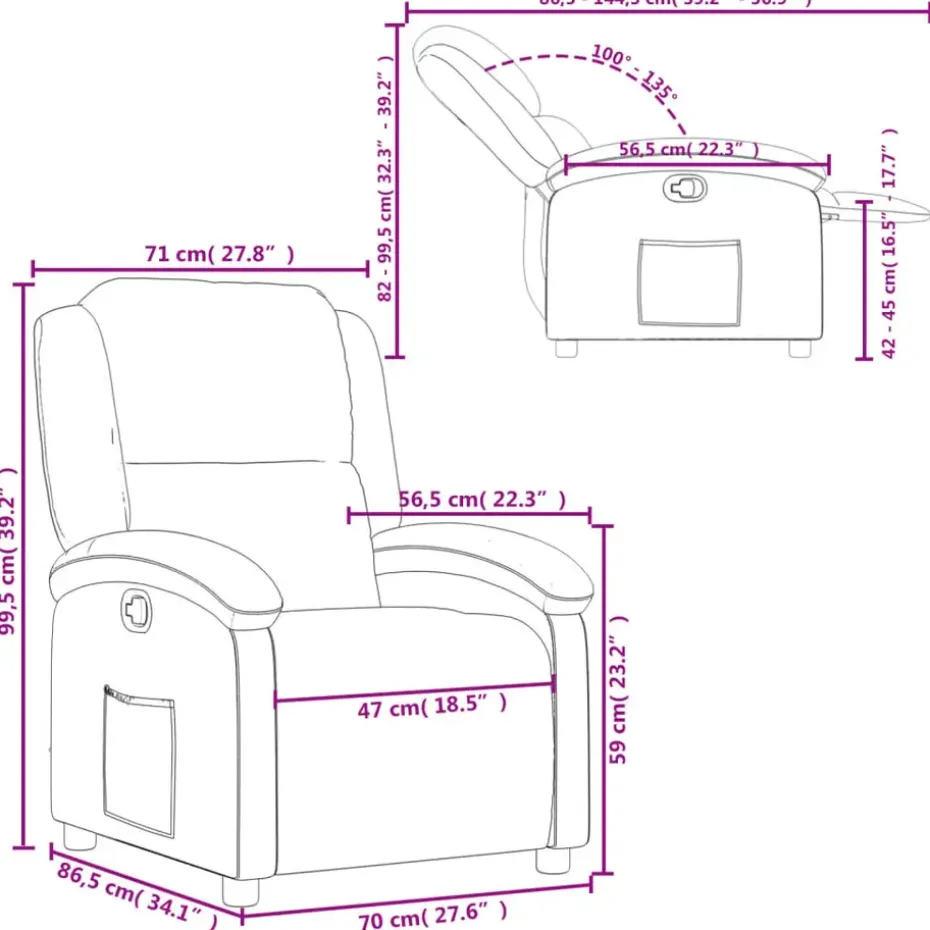 - Afmetingen zitpositie: 71 x 86,5 x 99,5 cm (B x D x H)