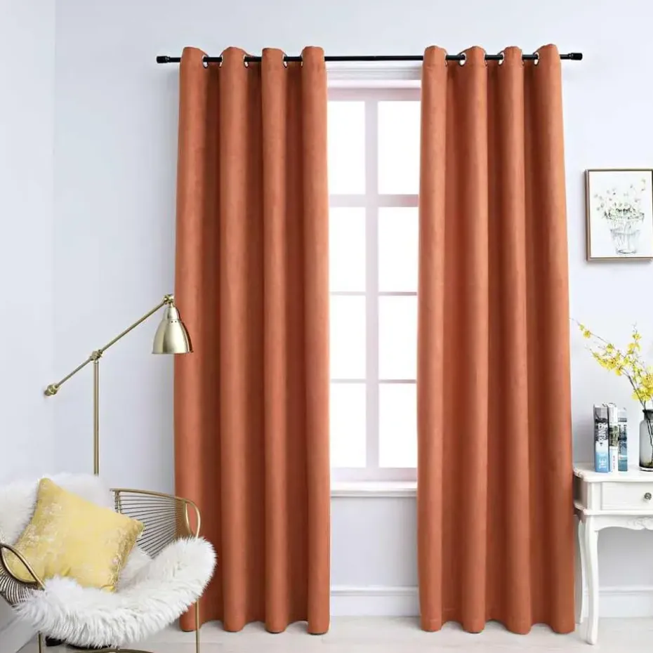 Het gordijn heeft een simpel, tijdloos ontwerp. Dankzij de metalen ringen kunnen de gordijnen eenvoudig aan elk type gordijnroede opgehangen worden. De gordijnen hebben een suède-touch en zijn gemaakt van premium polyester. Ze kunnen in de wasmachine worden gewassen.