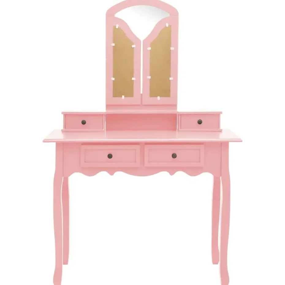 Onze charmante kaptafel met krukje is gemaakt van hoogwaardig paulowniahout. De Victoriaanse stijl en mooie roze afwerking geven een vleugje elegantie en schoonheid aan je slaapkamer, opmaakkamer of inloopkast. Het uitstekende vakmanschap maakt de kaptafelset nog opvallender.