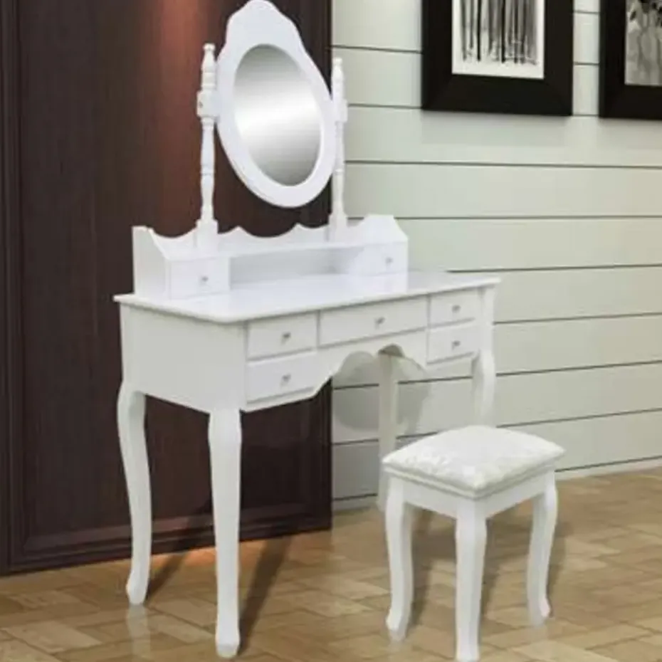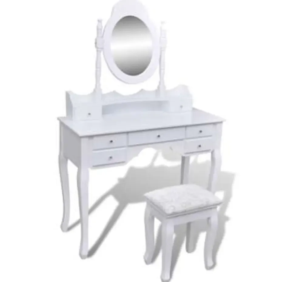De tafelspiegel is vrijstaand, dus hij kan naar iedere gewenste hoek worden gekanteld. De spiegel en de tafel kunnen afzonderlijk van elkaar worden gebruikt. De 7 mooie lades bieden je extra opslagruimte voor je snuisterijen, make-up en persoonlijke eigendommen. Deze set van een kaptafel en krukje is een echte blikvanger, waar hij ook staat.