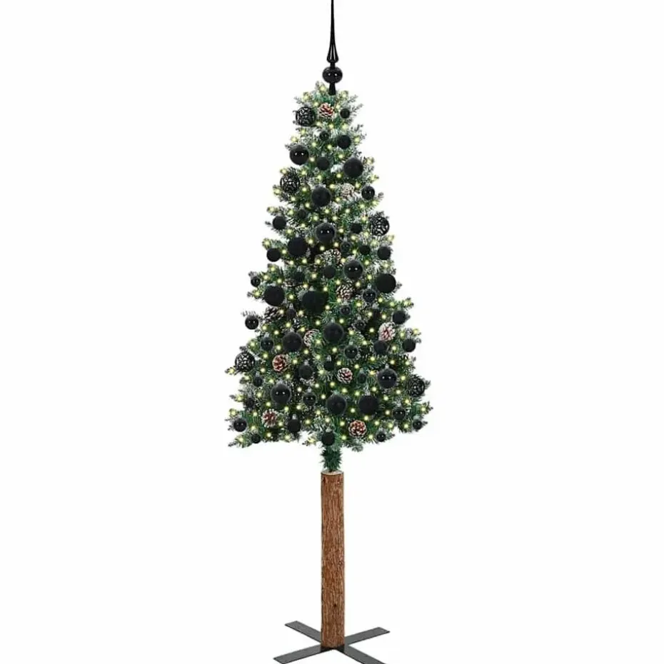 - Decoratief met dennenappels en ornamentballen, Realistische takkenpunten met bevroren sneeuw, Echte houten stam