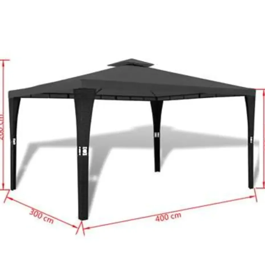 Het frame is gemaakt van staal met een poedercoating en is roestbestendig en licht van gewicht. Het geweven wicker geeft een chique en aantrekkelijke uitstraling aan het paviljoen. Het dak is gemaakt van waterbestendig, UV-bestendig en duurzaam polyester. De dubbele dak constructie dient voor lucht circulatie op een warme dag. Het paviljoen is duurzaam.