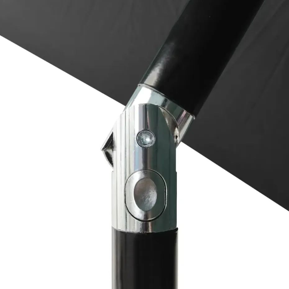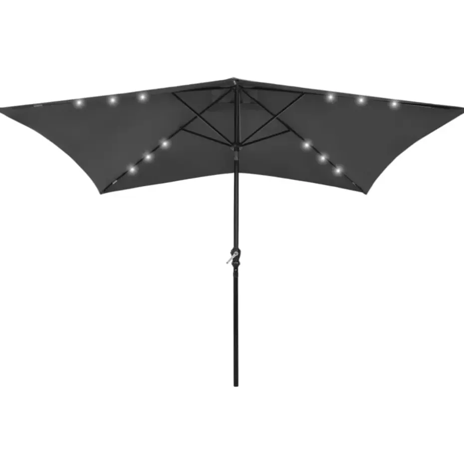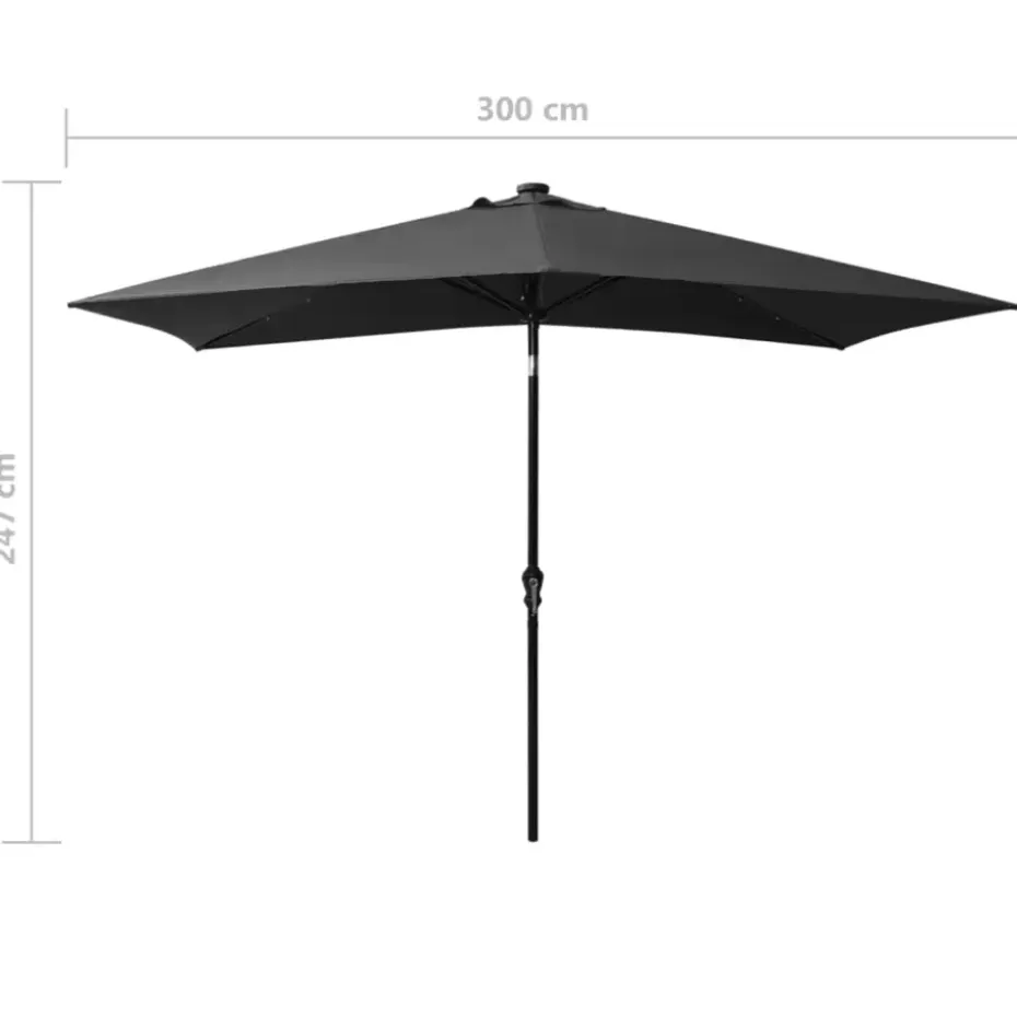 Het parasoldoek is gemaakt van uv-beschermend en anti-vervagend polyester, waardoor het je optimale bescherming tegen de zon biedt. De gepoedercoat stalen paal en baleinen zorgen voor stabiliteit. Dankzij de handslinger en het kantelmechanisme is de parasol inklapbaar en draagbaar. Hij kan worden gemonteerd op een bestaande standaard of in het midden van de tafel als hij een parasolgat heeft. De geïntegreerde LED-verlichting, gevoed door het zonnepaneel, zorgt voor een knusse, romantische sfeer.