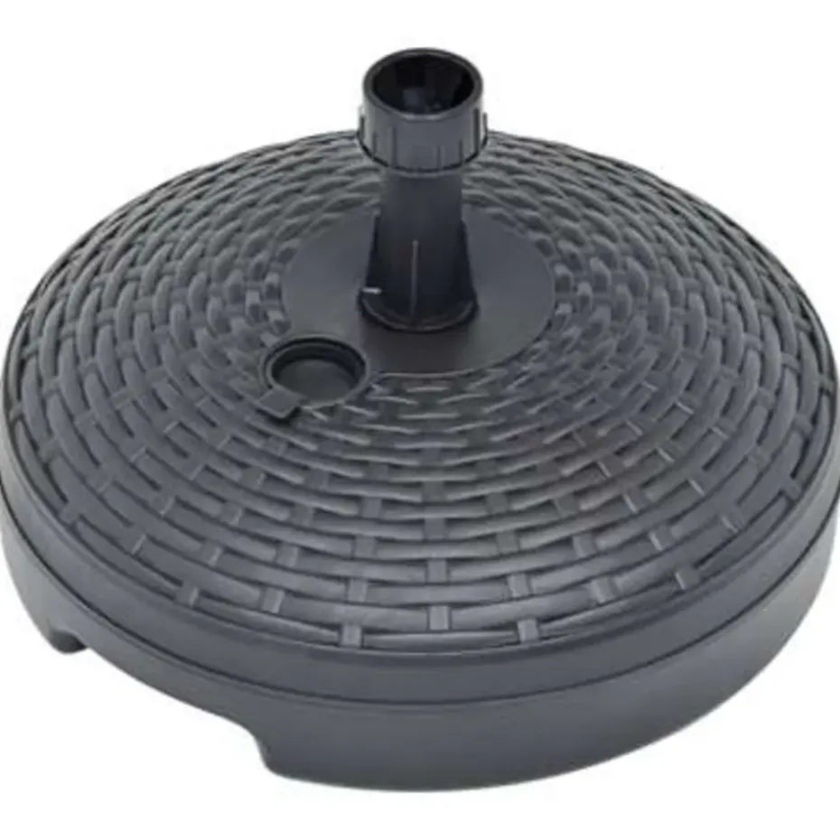 Deze parasolvoet met rattan patroon is ontworpen om te worden gevuld met water of zand. Hij dient als een stevige en stabiele basis voor je parasol.