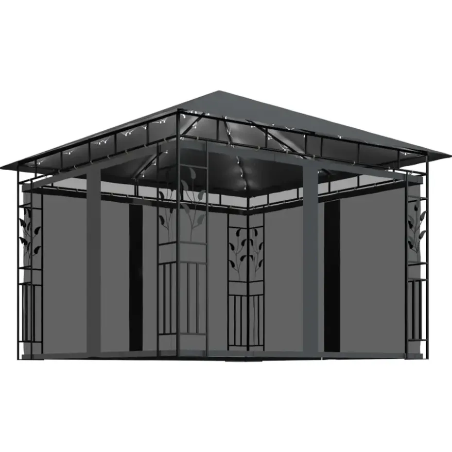 Het frame heeft een stevige metalen constructie waardoor het frame duurzaam en stabiel is. Een stoffen luifel beschermt je tegen de brandende zon, zodat je comfortabeler van je buitenactiviteiten kunt genieten. Deze tent, voorzien van muskietennetten, beschermt je tegen insecten en muggen. Zo kan je ongestoord genieten van je tijd in de tuin. Ook kan dit prieel in korte tijd worden geïnstalleerd. De lichtslinger zorgt voor een comfortabele sfeer in je tuin zodra de zon ondergaat. De verlichting werkt op zonne-energie en is dus milieuvriendelijk.