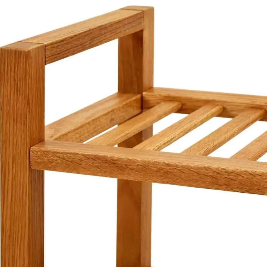 Het houten schoenenrek is vakkundig vervaardigd van duurzaam, massief eikenhout en is zeer functioneel. Dankzij het compacte ontwerp en de handgrepen neemt het rek heel weinig ruimte in beslag en is het gemakkelijk te verplaatsen. De stevige schappen zijn ideaal om je schoenen goed geventileerd te houden. Met dit schoenenrek hoef je je nooit meer te ergeren aan rondslingerende schoenen in huis.