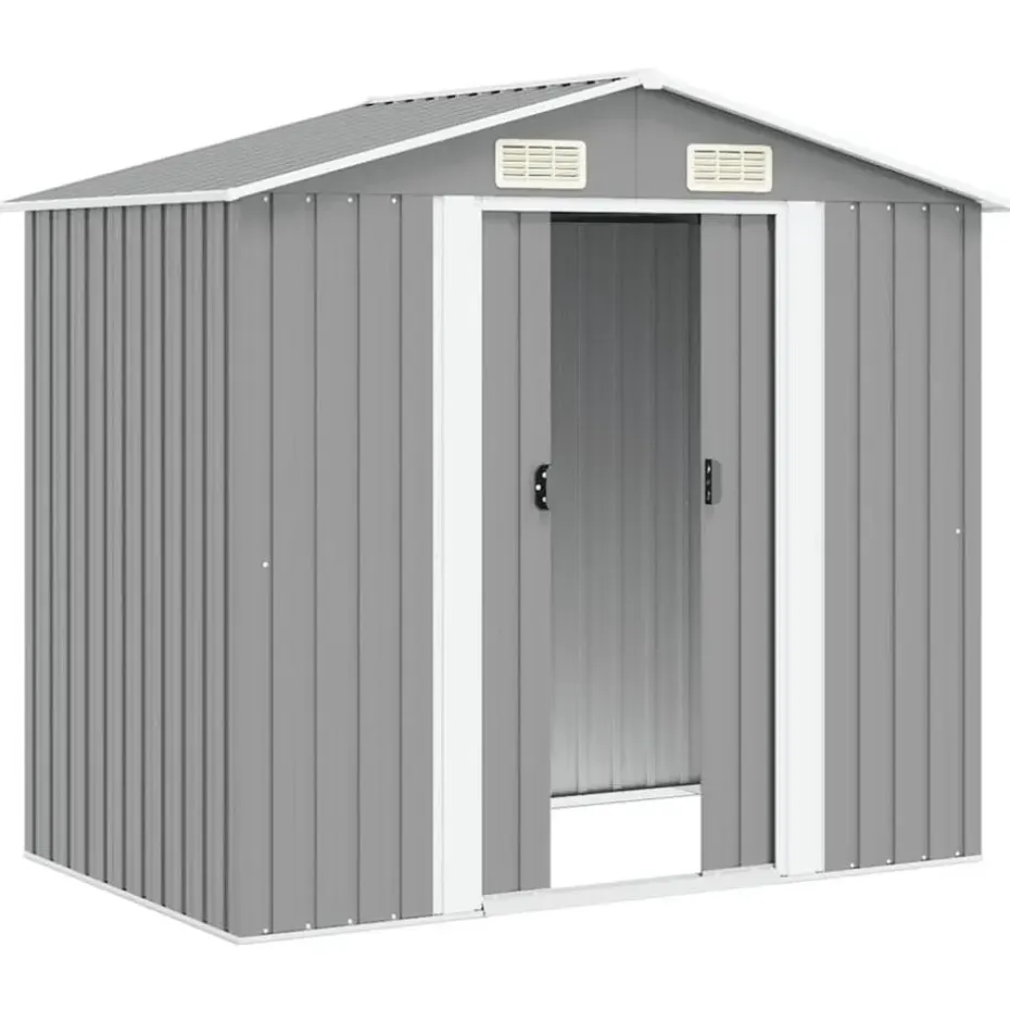 De schuur heeft 4 ventilatiepunten, 2 aan de voorkant en 2 aan de achterkant, waardoor goede ventilatie is gewaarborgd. De dubbele schuifdeur aan de voorkant zorgt ervoor dat je er gemakkelijk in en uit kunt.