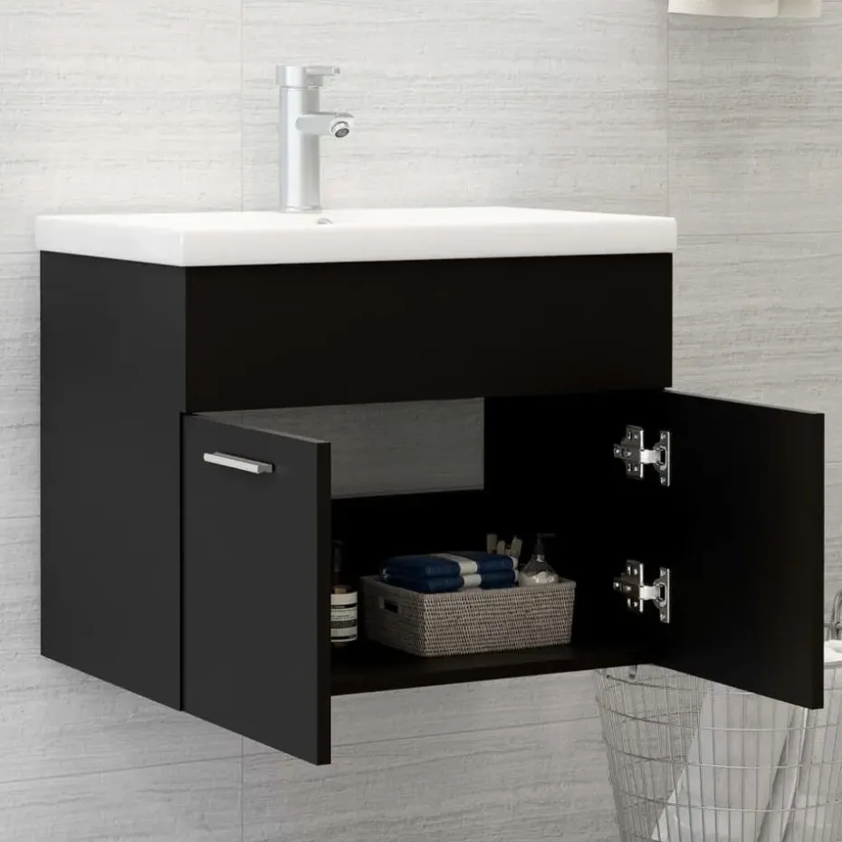 De kast is gemaakt van spaanplaat, waardoor hij stevig en stabiel is. De opbergkast heeft 1 vak en 2 deuren, waardoor er voldoende ruimte is om spullen op te bergen. Hij past perfect onder de gootsteen en maakt het opbergen in de badkamer heel handig. De wastafel is gemaakt van keramiek en dient niet alleen als product voor dagelijks gebruik, maar ook als versiering in je leefruimte. Dankzij zijn trendy en eigentijdse ontwerp past deze wastafel beslist in elk interieur. De overloop zorgt ervoor dat de bak nooit over kan lopen. Het geglazuurde oppervlak geeft een modern en elegant tintje aan deze wastafel. Daarnaast zijn de kast en wastafel eenvoudig schoon te maken met een vochtige doek.