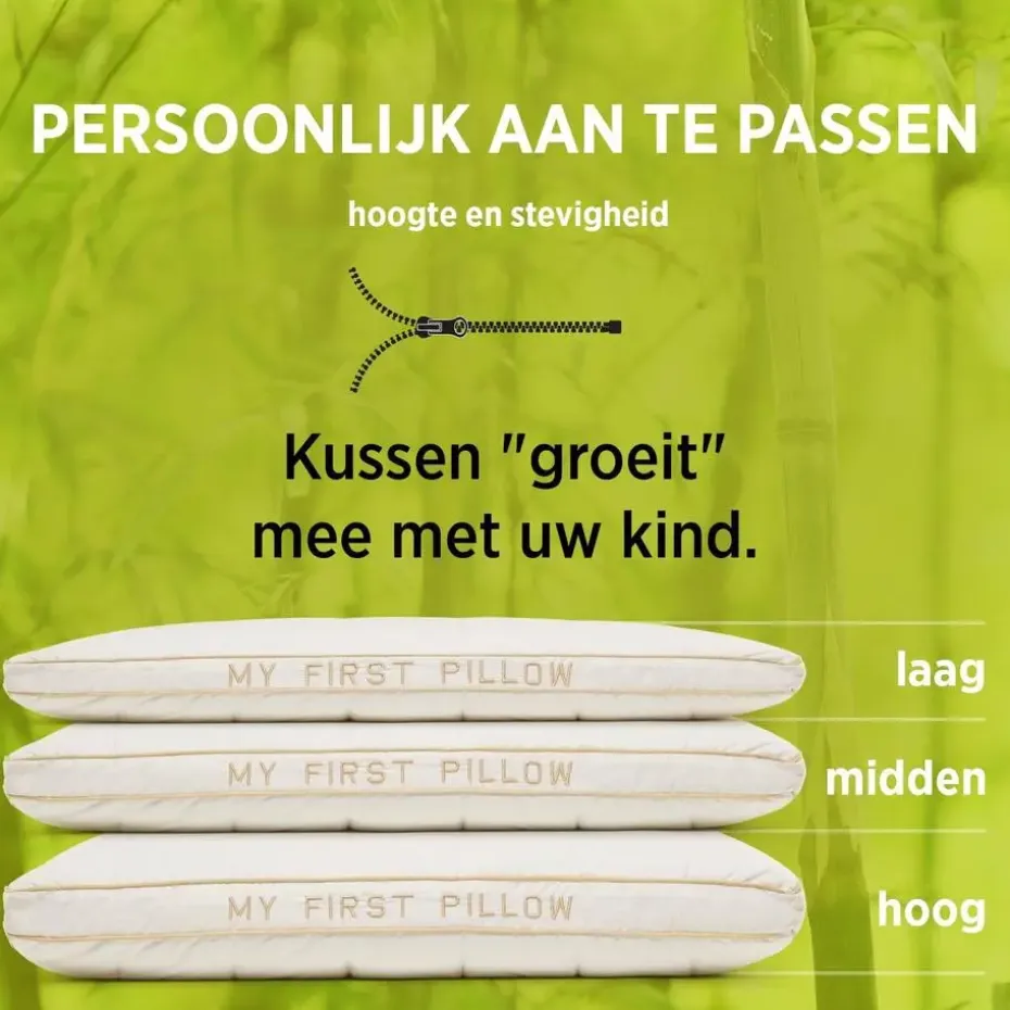 Het My First Pillow is één van de bestverkochte kinderkussens en zorgt voor de meest rustgevende slaap van uw kind. Het biedt uitstekende ondersteuning in alle slaaphoudingen voor de ruggengraat en de nek van je kind. Het kussen is geschikt voor kinderen vanaf 1 jaar. Door de verstelbare hoogte en stevigheid kan het kussen “meegroeien” met de leeftijd van het kind. De combinatie van ongebleekt katoen en natuurlijke bamboevezels in de kussensloop zijn speciaal ontwikkeld voor de gevoelige huid.