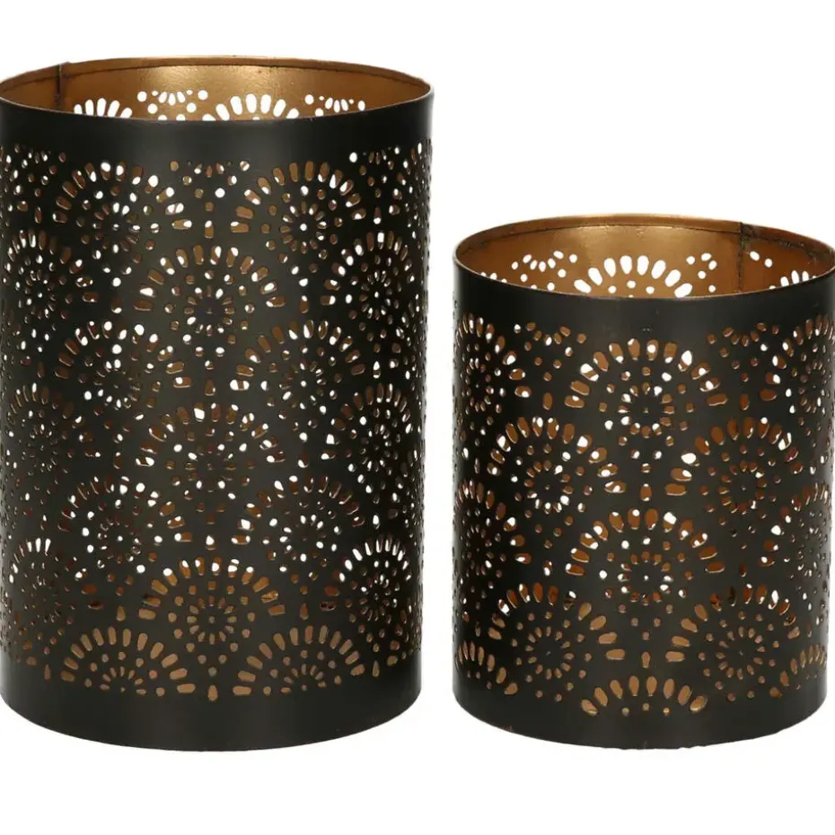 Windlichten set van 2x stuks met motief. Deze theelichthouders zijn aan de buitenzijde zwart en hebben aan de binnenzijde een metallic koperen afwerking. De houders hebben twee verschillende formaten, het kleine model heeft een diameter van circa 8 cm en een hoogte van circa 10 cm. Het grotere model heeft een diameter van circa 10 cm en een hoogte van circa 15 cm.