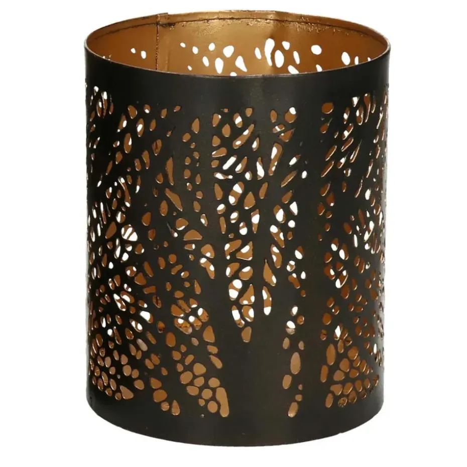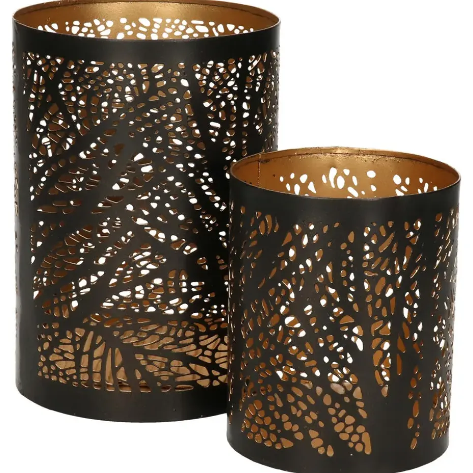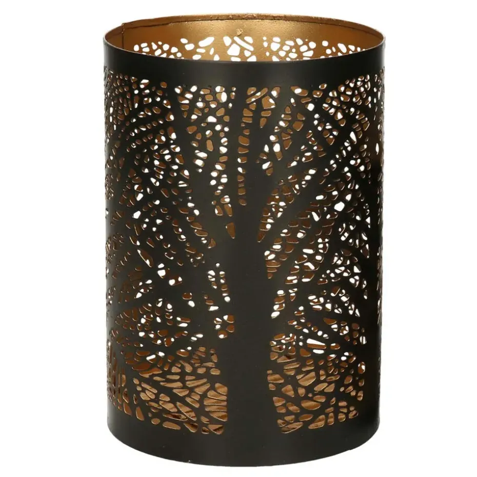 Windlichten set van 2x stuks met levensboom motief. Deze theelichthouders zijn aan de buitenzijde zwart en hebben aan de binnenzijde een metallic koperen afwerking. De houders hebben twee verschillende formaten, het kleine model heeft een diameter van circa 8 cm en een hoogte van circa 10 cm. Het grotere model heeft een diameter van circa 10 cm en een hoogte van circa 15 cm.