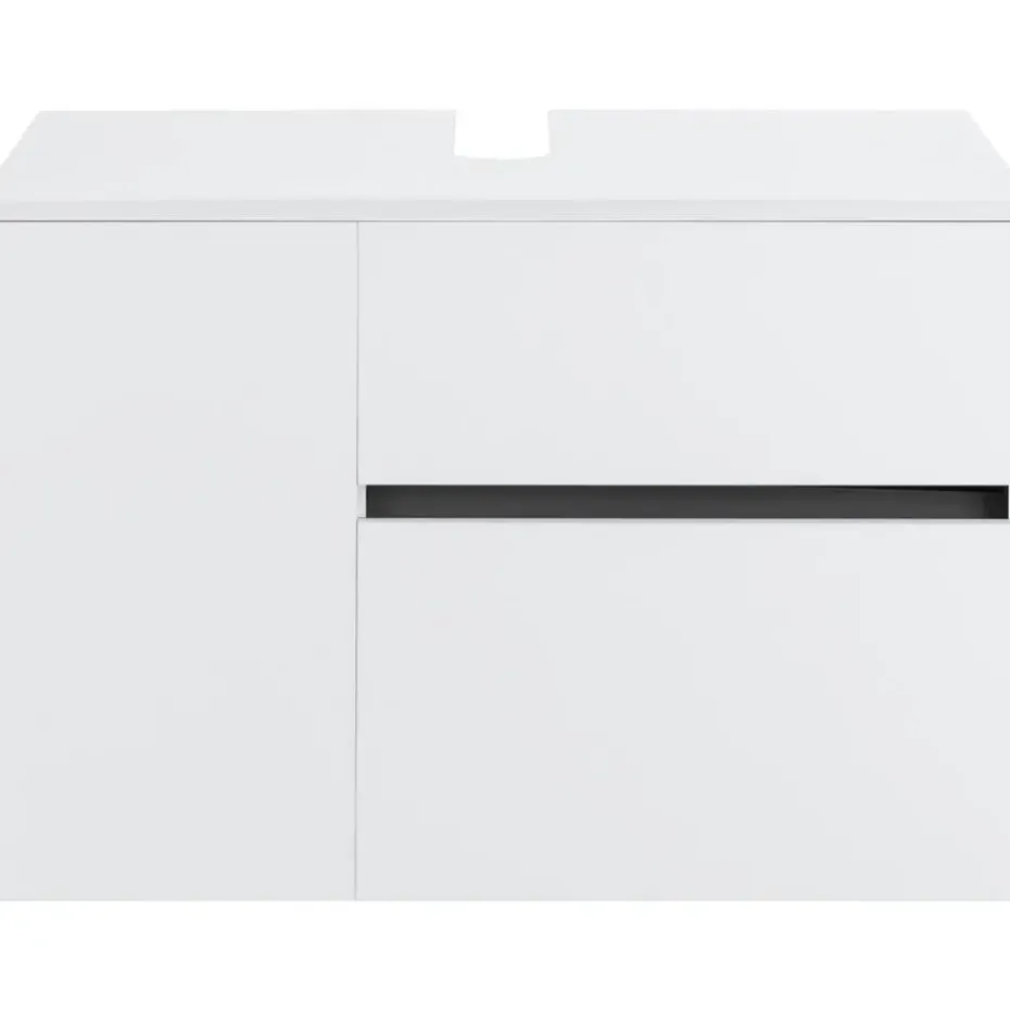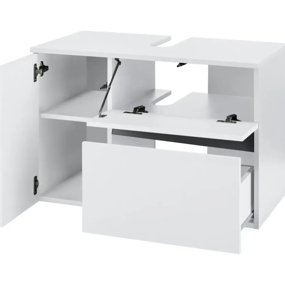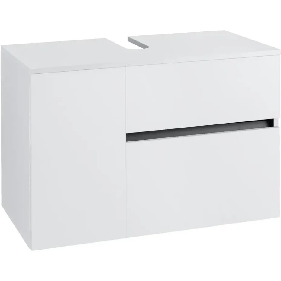 Het badmeubel met matte fronten geeft je badkamer een modern tintje. Achter de deur en klep met push-open functie zit handige opbergruimte voor verschillende gebruiksvoorwerpen. Het badmeubel heeft ook een ruime lade.