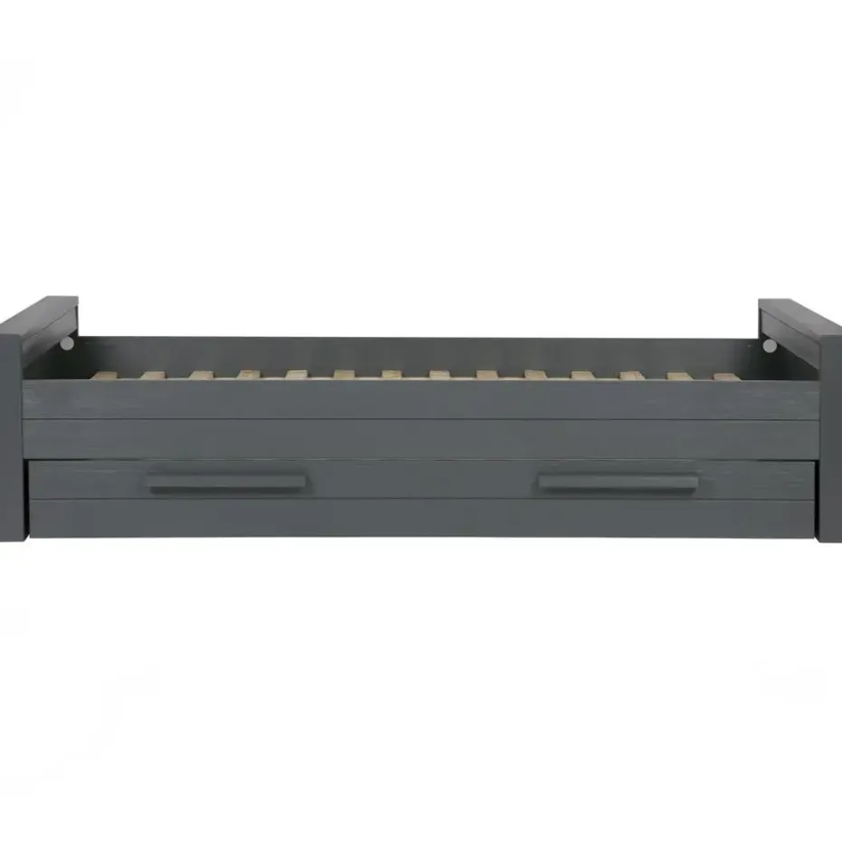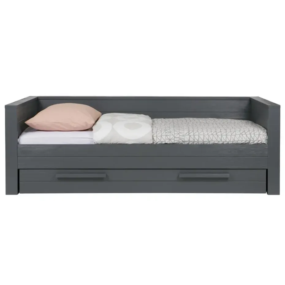 WOOOD Dennis Bed incl. matras/bedlade 219x53x95 (bxhxd) is een moderne en stoere bed voor een kinder- en tienerslaapkamer. Het Dennis bed incl. matras/bedlade is voor één-persoon en komt uit de collectie van het Nederlandse merk WOOOD. Het bed en matras/bedlade zijn gemaakt van grenenhout met een staal grijze finish en heeft een geborstelde afwerking waardoor het bed een éxtra robuuste en stoere uitstraling krijgt. De matras/bedlade wordt standaard geleverd als opberglade, maar wanneer er een lattenbodem met lint (90×200) en een matras (90x190x12) wordt toegevoegd kan de lade ook worden gebruikt als logeerbed. De Dennis bedbank wordt exclusief matras (90×200) en inclusief lattenbodem geleverd.