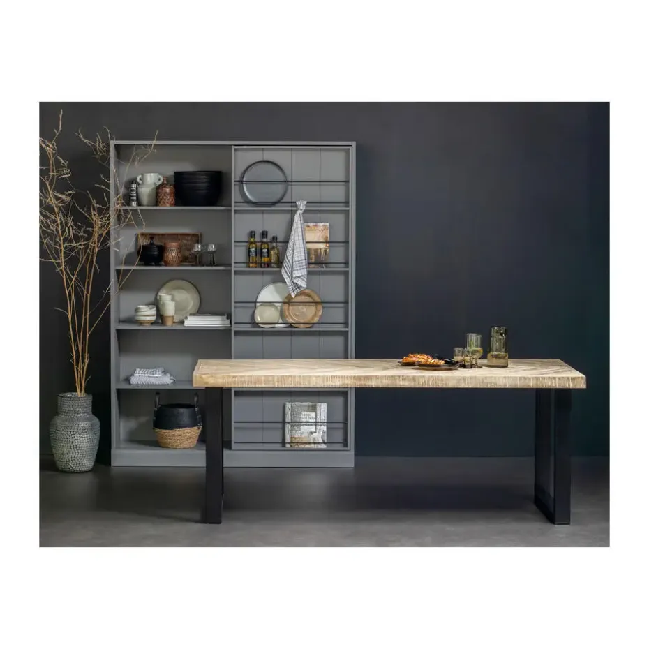 Deze mangohouten Tablo tafel heeft een lengte van 180 cm en een breedte van 90 cm, zodat je er gemakkelijk met 4-6 personen aan kunt zitten. Het blad is 5,5 cm dik en is voorzien van een prachtig visgraat patroon. Het tafelblad beschikt over een opdikrand aan alle vier de zijden.