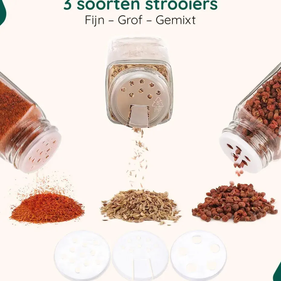 Alles om te vullen, labelen, strooienIn het pakket vind je alle benodigdheden om het organizen van kruiden zo makkelijk mogelijk te maken. Een trechter voor het vullen van de potjes, stickers om alle potjes van naam te voorzien. En verschillende strooideksels voor zowel fijne kruiden als de grovere specerijen.