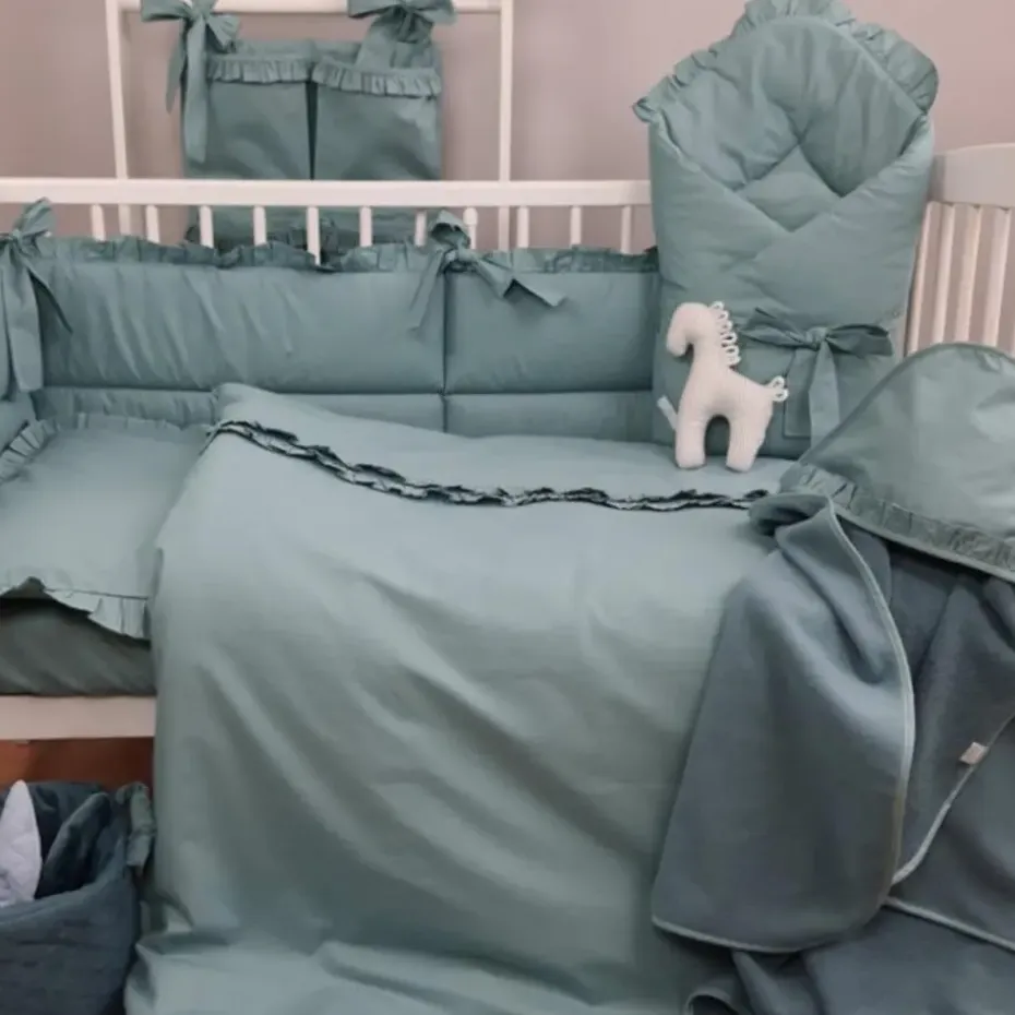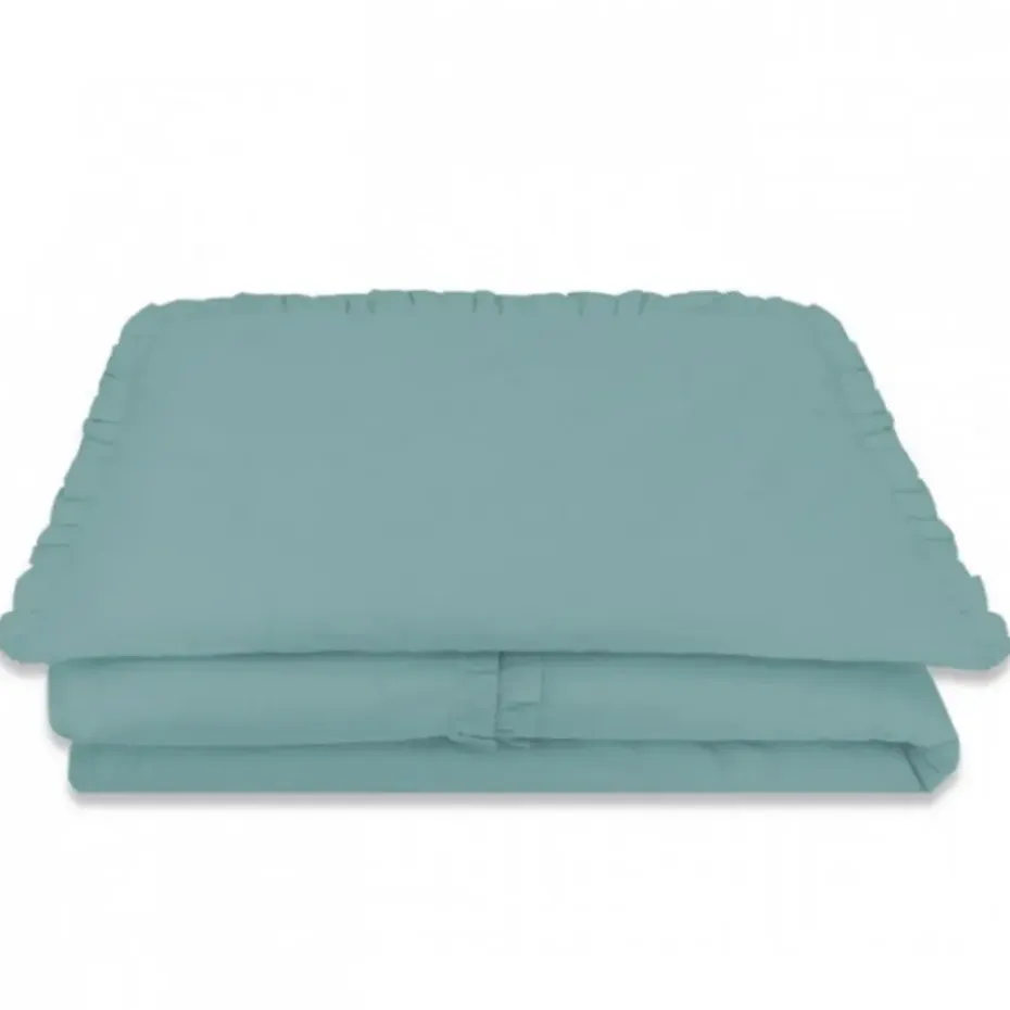 Dit peuter dekbedovertrek heeft een chique en rustgevende uitstraling door de effen groenblauwe kleur en verfijnde details. Het ontwerp is afgewerkt met sierlijke ruches langs de randen van zowel de dekbedovertrek als de kussensloop, wat een klassiek en elegant effect creëert. Daarnaast loopt er een smalle strook met geplooide ruches over het dekbedovertrek, wat zorgt voor een luxueuze en charmante afwerking.