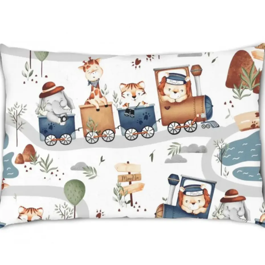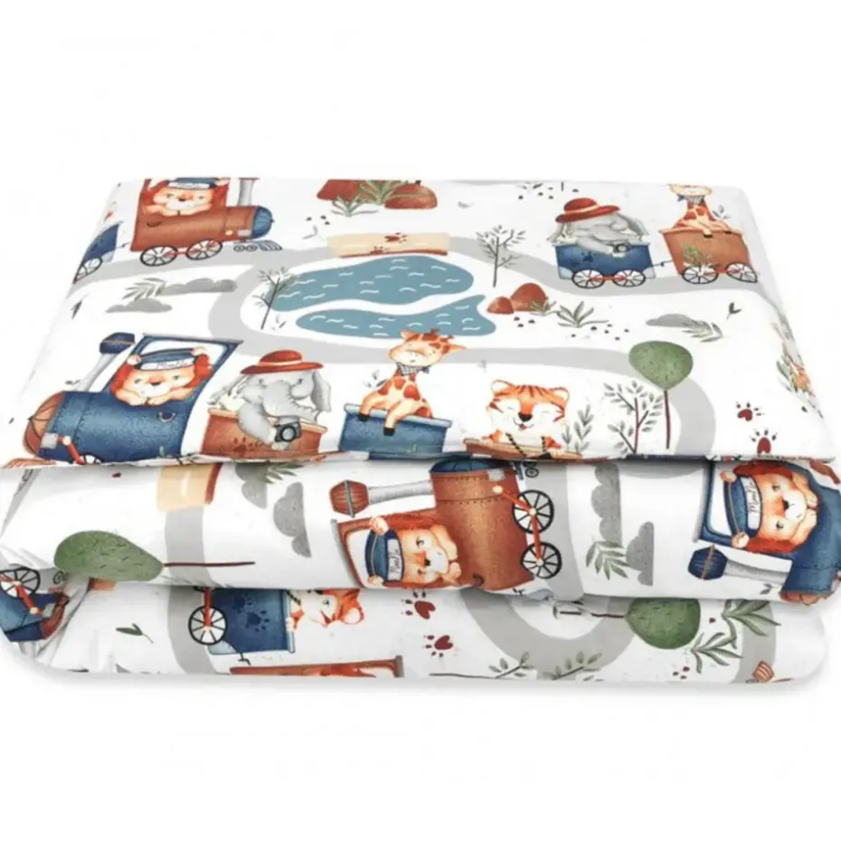 Dit dessin heeft een speelse en avontuurlijke uitstraling, perfect voor een kinderkamer. Het patroon toont een vrolijke treintje dat over een kronkelend spoor rijdt door een landschap met bomen, struiken, vijvers en bruggetjes. In de treinwagons zitten schattige dieren, zoals een olifant en een tijger, die een gezellige en fantasierijke sfeer creëren. De kleuren zijn warm en natuurlijk, met tinten van blauw, groen, bruin en oranje, wat het dessin een zachte en harmonieuze uitstraling geeft. Dit dekbedovertrek is ideaal voor kleine treinliefhebbers en dierenfans!